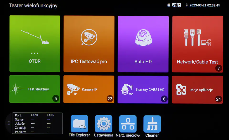 | Wybrane funkcje: | Reflektometr optyczny (OTDR) Test kamer AHD Test kamer HD-CVI Test kamer HD-TVI Test kamer HD-SDI Test kamer PAL/NTSC Test kamer IP - Obsługiwane metody kompresji obrazu : H.265, H.264, MJPEG Wyszukiwanie i podgląd kamer IP zgodnych z Onvif Sterowanie obrotnicami i kamerami PTZ (speed dome) Podgląd z kamer IP za pomocą wbudowanych aplikacji - DH test tool, Hik test tool, UNV Test Tool, HuaWei Tool, TP-Link tool, Tiandy toolEZView Wbudowana kamera (możliwość robienia zdjęć oraz nagrywania filmów) Wbudowana przeglądarka internetowa - Google Chrome Monitorowanie połączeń LAN Skaner adresów IP PING - testowanie łącza za pomocą pakietów ICMP Wykrywanie podłączonego portu w switchu Tester skrętki komputerowej Aplikacja Cable tracer - łatwa lokalizacja przewodu w nieuporządkowanej wiązce Współpraca z kamerami i switchami PoE Miernik zasilania PoE Źródło zasilania DC 5V / 12V / 24V / 48V Reflektometr TDR Miernik mocy optycznej Port modułu światłowodowego Gigabit SFP do testu sieci światłowodowej VLS (VFL) - wizualny lokalizator uszkodzeń włókien światłowodowych Data monitor - monitor portu szeregowego RS-485 Dalmierz laserowy : 100 m ± 3 mm Digital Multimeter - multimetr cyfrowy Test audio Hotspot - Wi-Fi Odtwarzanie nagrań Zainstalowana aplikacja VLC Media Player - możliwość odtwarzania plików multimedialnych w wielu popularnych formatach (.mp3, .mp4, .avi, .mpeg i inne) Gniazdo microSD - W komplecie znajduje się karta pamięci 8 GB Kalkulator Zainstalowany pakiet Quickoffice - tworzenie i odczyt dokumentów tekstowych .docx, arkuszy kalkulacyjnych .xlsx oraz prezentacji multimedialnych .pptx Wbudowana latarka Możliwość zmiany wyświetlanego motywu oraz tła System Android 11 |