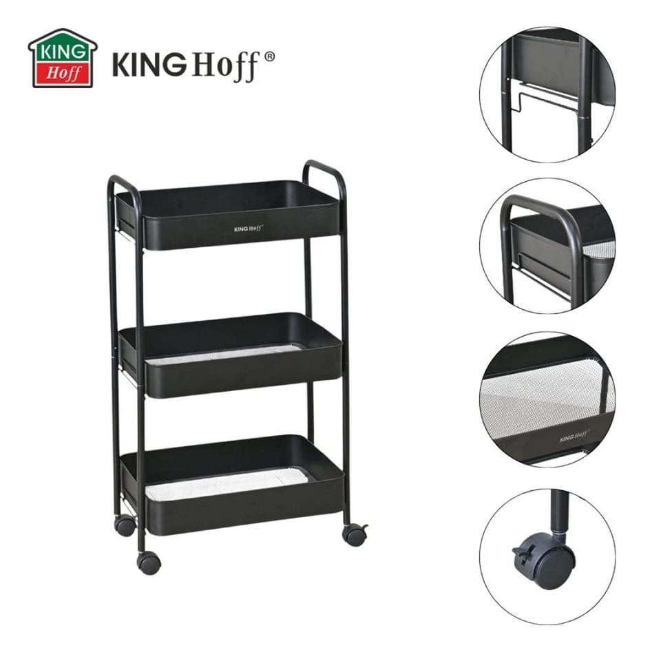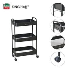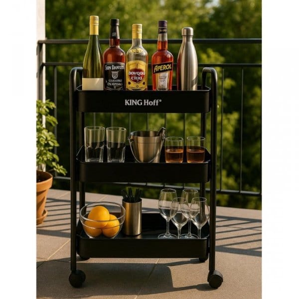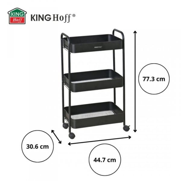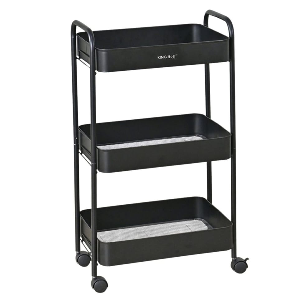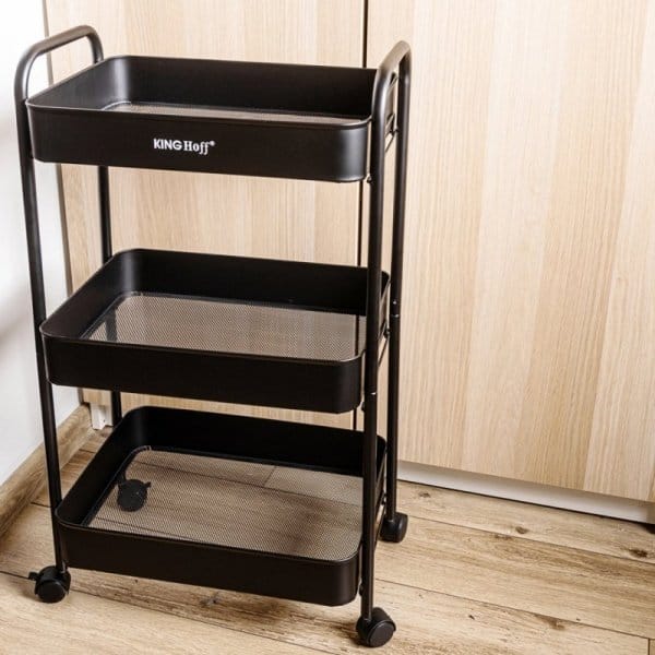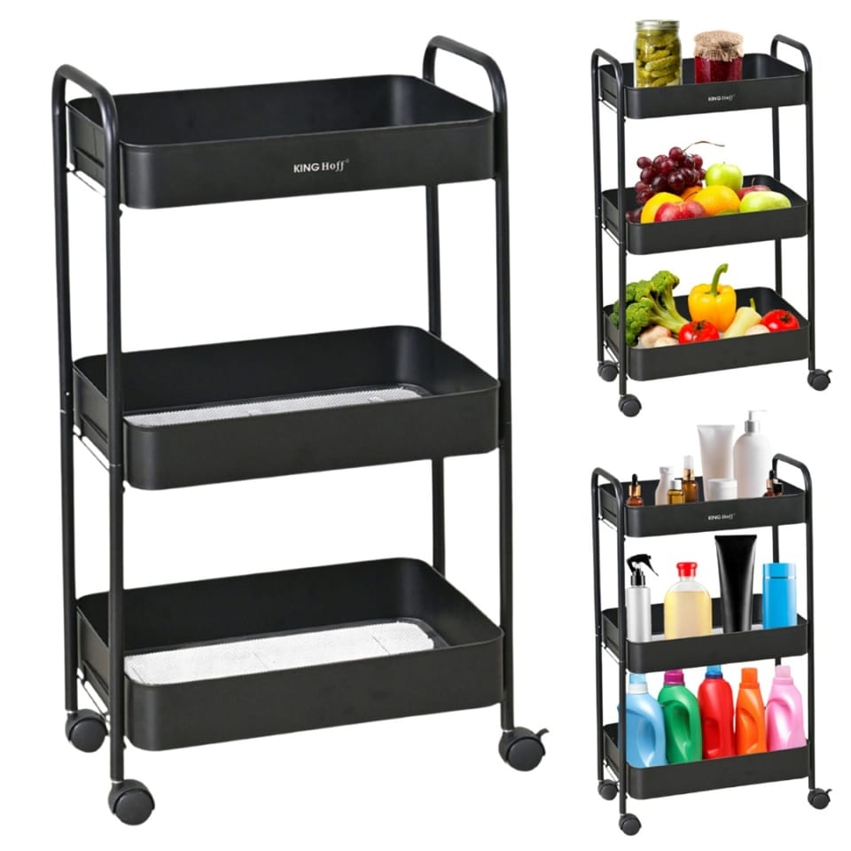 Elegancki, praktyczny i niezwykle funkcjonalny — trzypoziomowy regał mobilny KINGHoff to doskonałe rozwiązanie do kuchni, łazienki, salonu lub biura. Dzięki solidnej stalowej konstrukcji i nowoczesnemu czarnemu wykończeniu idealnie wpasuje się w każde wnętrze, zapewniając wygodne miejsce do przechowywania i łatwy dostęp do niezbędnych przedmiotów.
