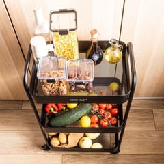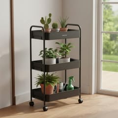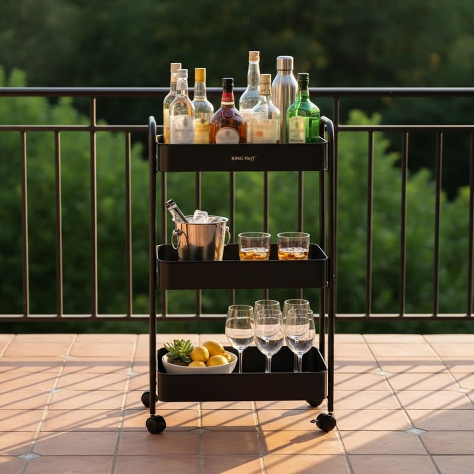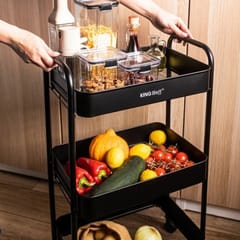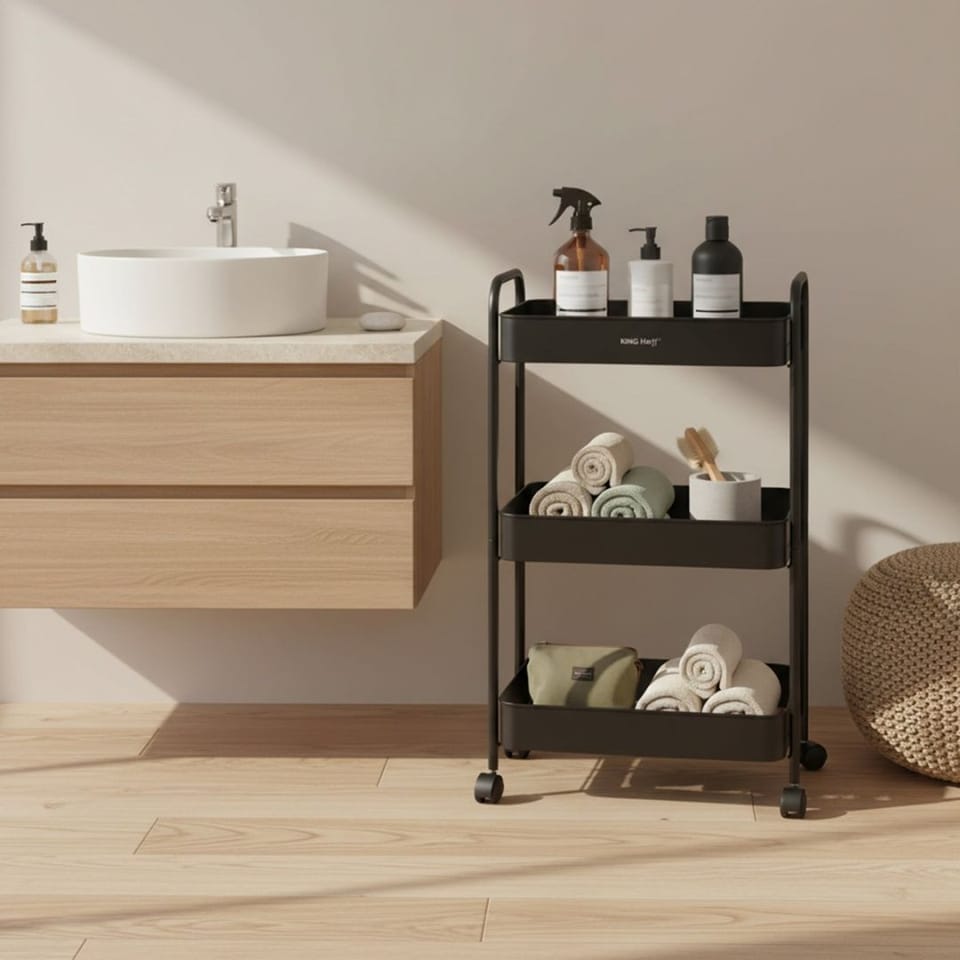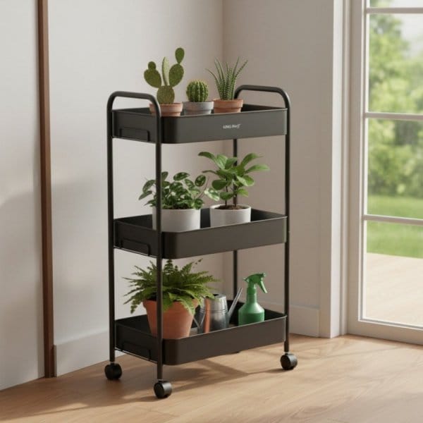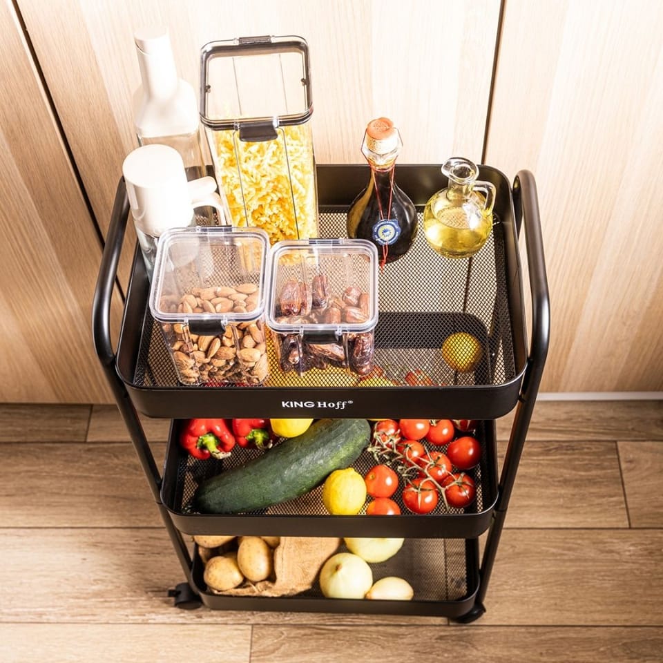 Elegancki, praktyczny i niezwykle funkcjonalny — trzypoziomowy regał mobilny KINGHoff to doskonałe rozwiązanie do kuchni, łazienki, salonu lub biura. Dzięki solidnej stalowej konstrukcji i nowoczesnemu czarnemu wykończeniu idealnie wpasuje się w każde wnętrze, zapewniając wygodne miejsce do przechowywania i łatwy dostęp do niezbędnych przedmiotów.