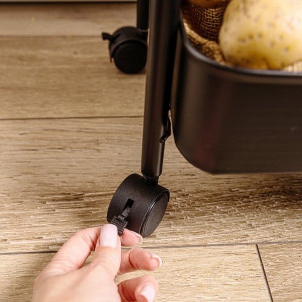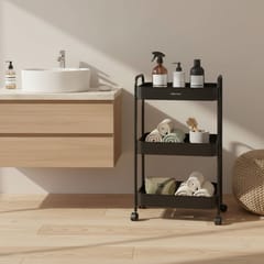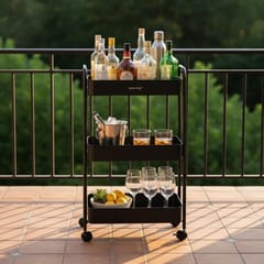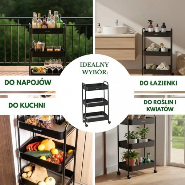 Regał został zaprojektowany z myślą o maksymalnej mobilności. Wyposażony w kółka obrotowe 360° oraz funkcję blokady, gwarantuje pełną kontrolę nad przemieszczaniem i stabilnością. Trzy przestronne półki oferują dużo miejsca na napoje, akcesoria kuchenne, kosmetyki, rośliny czy ręczniki — w zależności od potrzeb użytkownika.