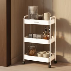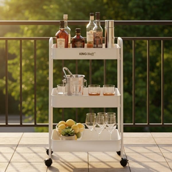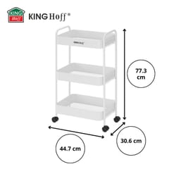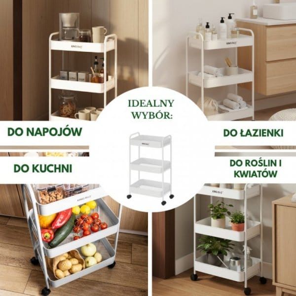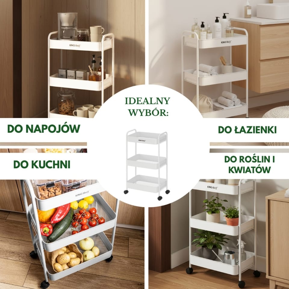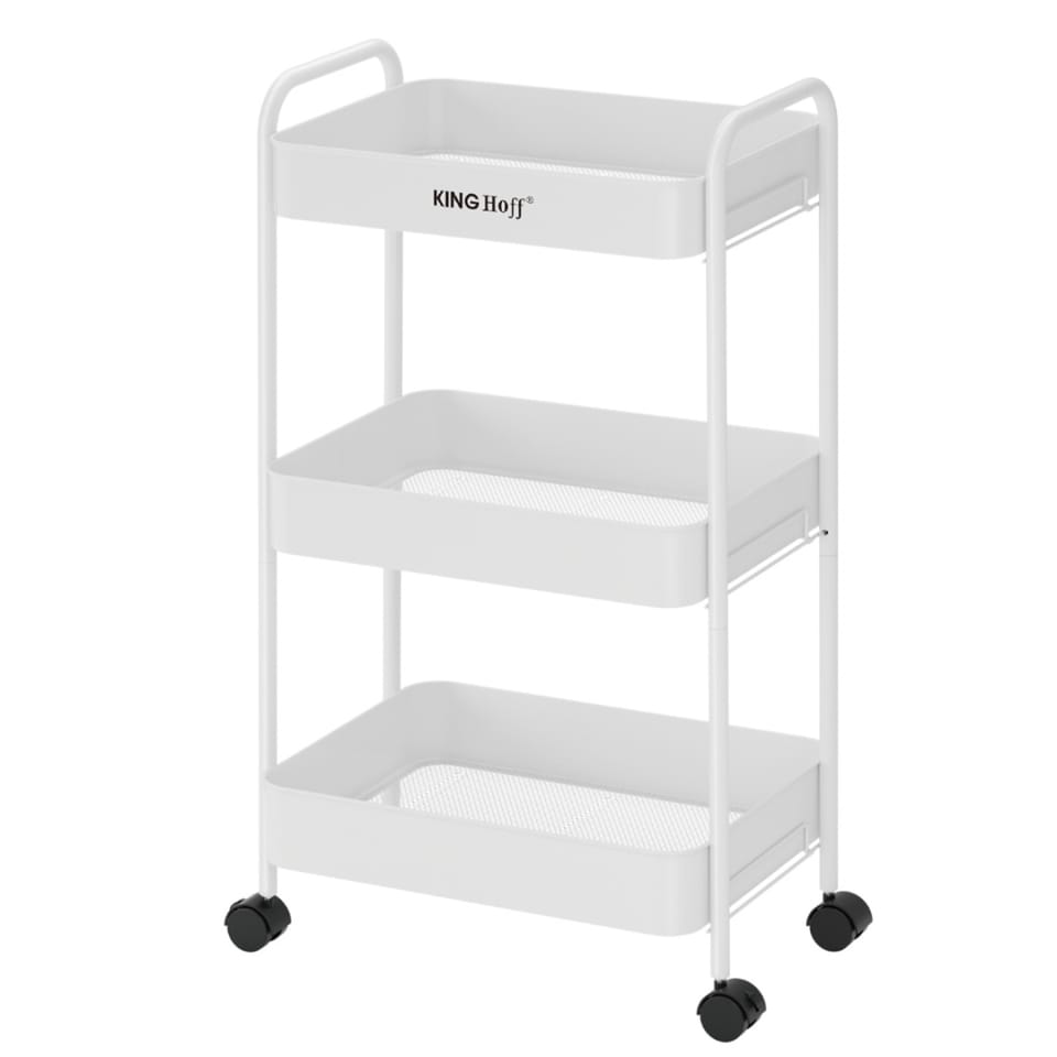 Elegancki, praktyczny i niezwykle funkcjonalny — trzypoziomowy regał mobilny KINGHoff to doskonałe rozwiązanie do kuchni, łazienki, salonu lub biura. Dzięki solidnej stalowej konstrukcji i nowoczesnemu białemu wykończeniu idealnie wpasuje się w każde wnętrze, zapewniając wygodne miejsce do przechowywania i łatwy dostęp do niezbędnych przedmiotów.