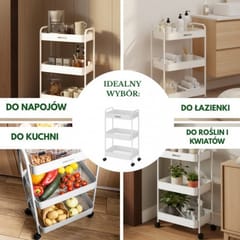 Regał został zaprojektowany z myślą o maksymalnej mobilności. Wyposażony w kółka obrotowe 360° oraz funkcję blokady, gwarantuje pełną kontrolę nad przemieszczaniem i stabilnością. Trzy przestronne półki oferują dużo miejsca na napoje, akcesoria kuchenne, kosmetyki, rośliny czy ręczniki — w zależności od potrzeb użytkownika.