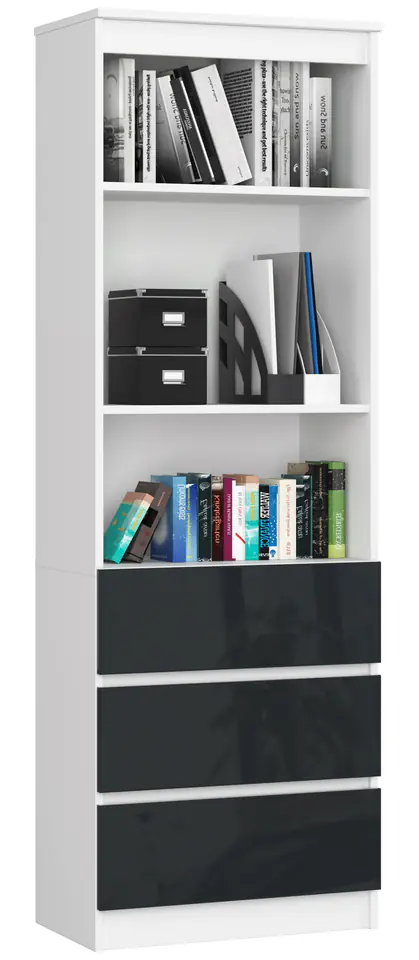 Nowoczesny regał biurowy z trzema pojemnymi szufladami i przestronnymi otwartymi półkami sprawdzi się w siedzibie firmy, w gabinecie domowym i w pokoju młodzieżowym. Mebel, dzięki zastosowaniu efektownego zestawienia kolorystycznego, bardzo atrakcyjnie wygląda. Fronty szuflad zostały zrobione z polakierowanej na wysoki połysk płyty meblowej w kolorze grafitowym, a matowy korpus regału ma odcień klasycznej bieli. Uniwersalna kolorystyka sprawia, że mebel dobrze się prezentuje zarówno ze ścianami i wyposażeniem pomieszczenia, które są utrzymane w ciemniejszej tonacji, jak i w zdecydowanie jasnych czy pastelowych odcieniach. Regał nadaje się do przechowywania książek, materiałów biurowych i segregatorów. Może też w części otwartej zostać przeznaczony na elementy dekoracyjne. Mebel został wykonany z płyty laminowanej, która jest odporna na zarysowania, ścieranie i uszkodzenia mechaniczne. Krawędzie regału są wykończone wytrzymałą i estetyczną okleiną ABS. Regał można czyścić z kurzu i zabrudzeń na sucho, jak również na mokro, ponieważ płyta laminowana jest odporna na wilgoć.