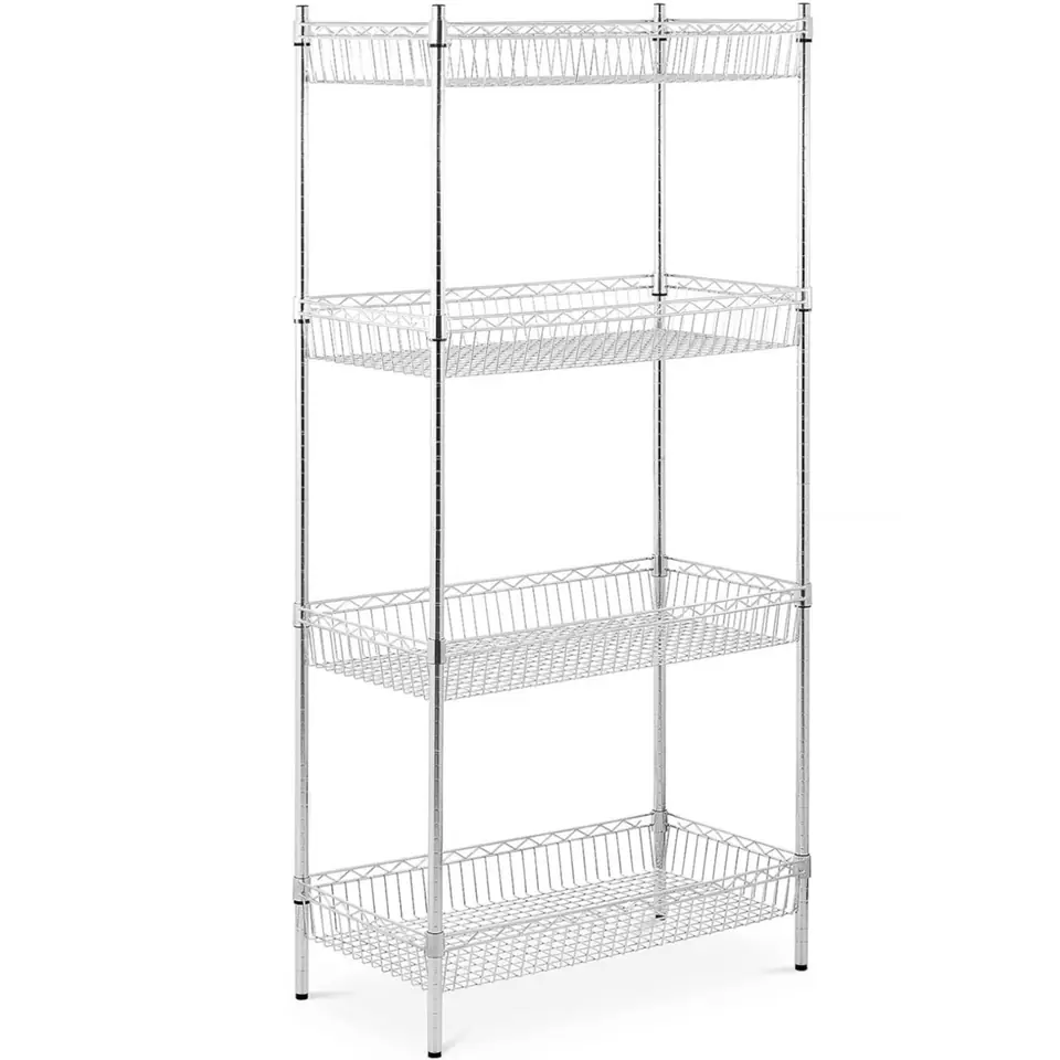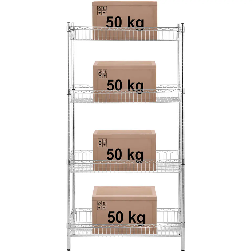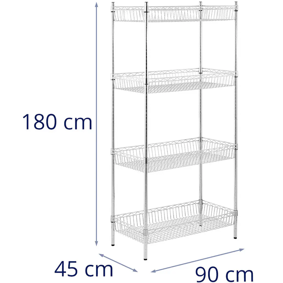 Metalowy regał marki Royal Catering sprawdzi się do przechowywania przedmiotów w kuchniach, hotelach, restauracjach, biurach czy magazynach. Mebel posiada 4 przepuszczające powietrze koszyki o wymiarach 900 x 450 mm. Nośność regału wynosi 200 kg, po 50 kg na każdą półkę. Otwarta konstrukcja umożliwia dostęp z każdej strony. Rama mebla składa się z 4 okrągłych rurek o wysokości 180 cm każda. Regał łączony jest bez użycia śrub, przy pomocy dołączonych elementów mocujących.