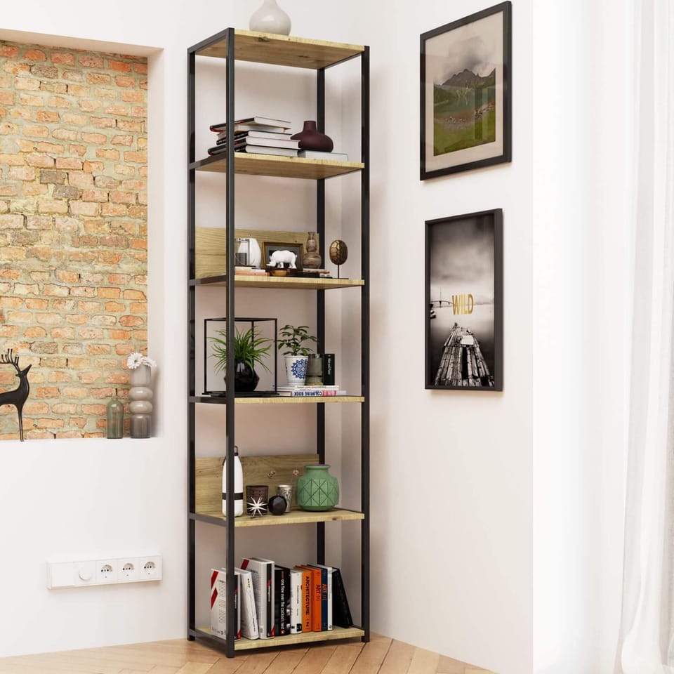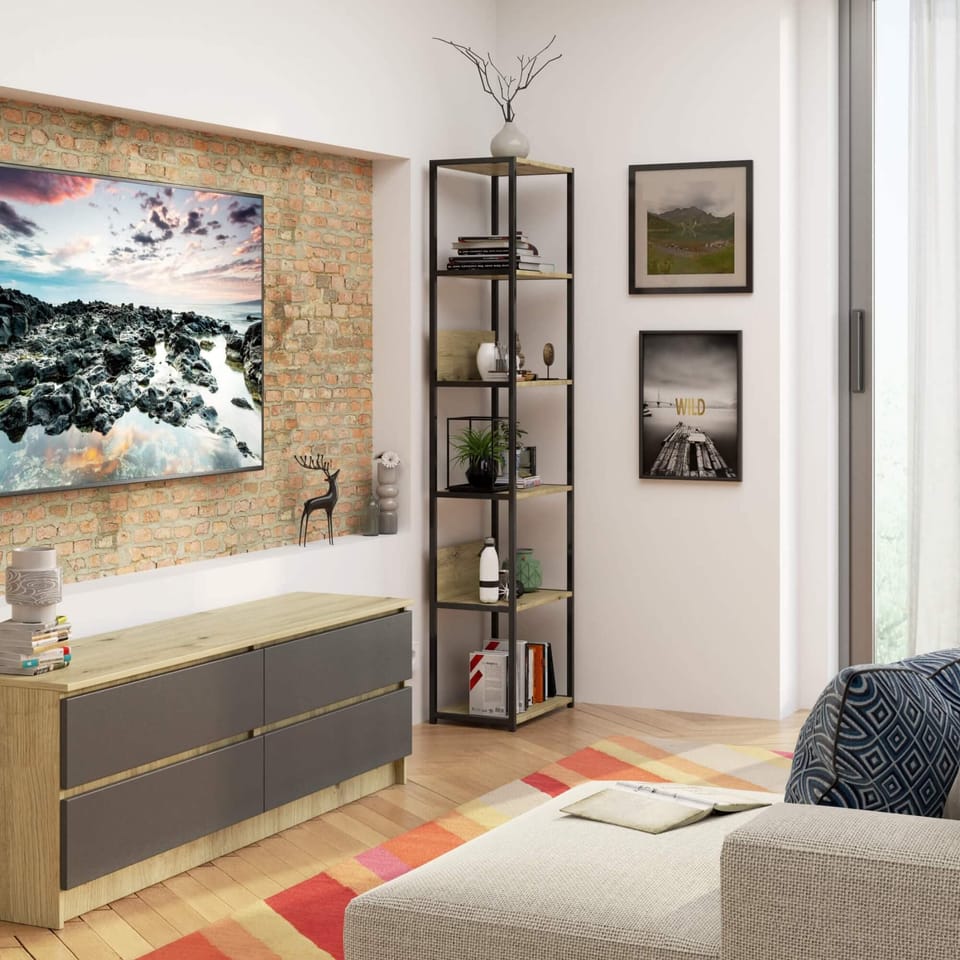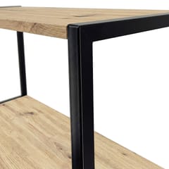 Regał industrialny metalowy to praktyczny i nowoczesny mebel, który sprawdzi się zarówno w salonie jak i biurze. Stelaż w kolorze czarnym. Półki regału zostały wykonane z płyty laminowanej o grubości 16 mm w kolorze dąb artisan. To trwały i wytrzymały materiał, wyróżniający się wysoką odpornością na ścieranie. Krawędzie zostały dodatkowo zabezpieczone obrzeżem ABS, dzięki czemu mebel cały czas będzie się dobrze prezentował, nawet przy bardzo intensywnym codziennym użytkowaniu. Całość prezentuje się bardzo nowocześnie.