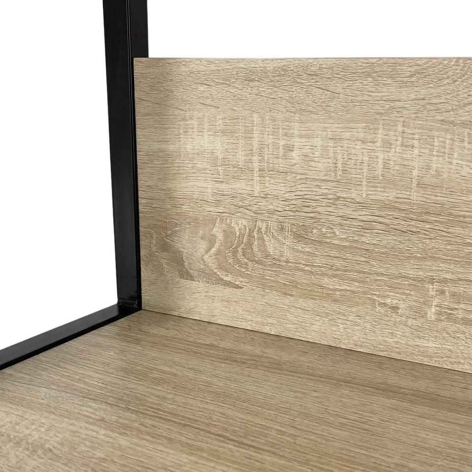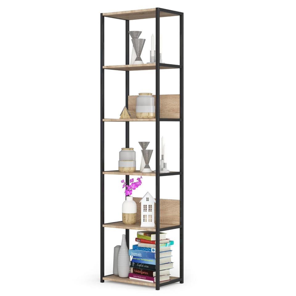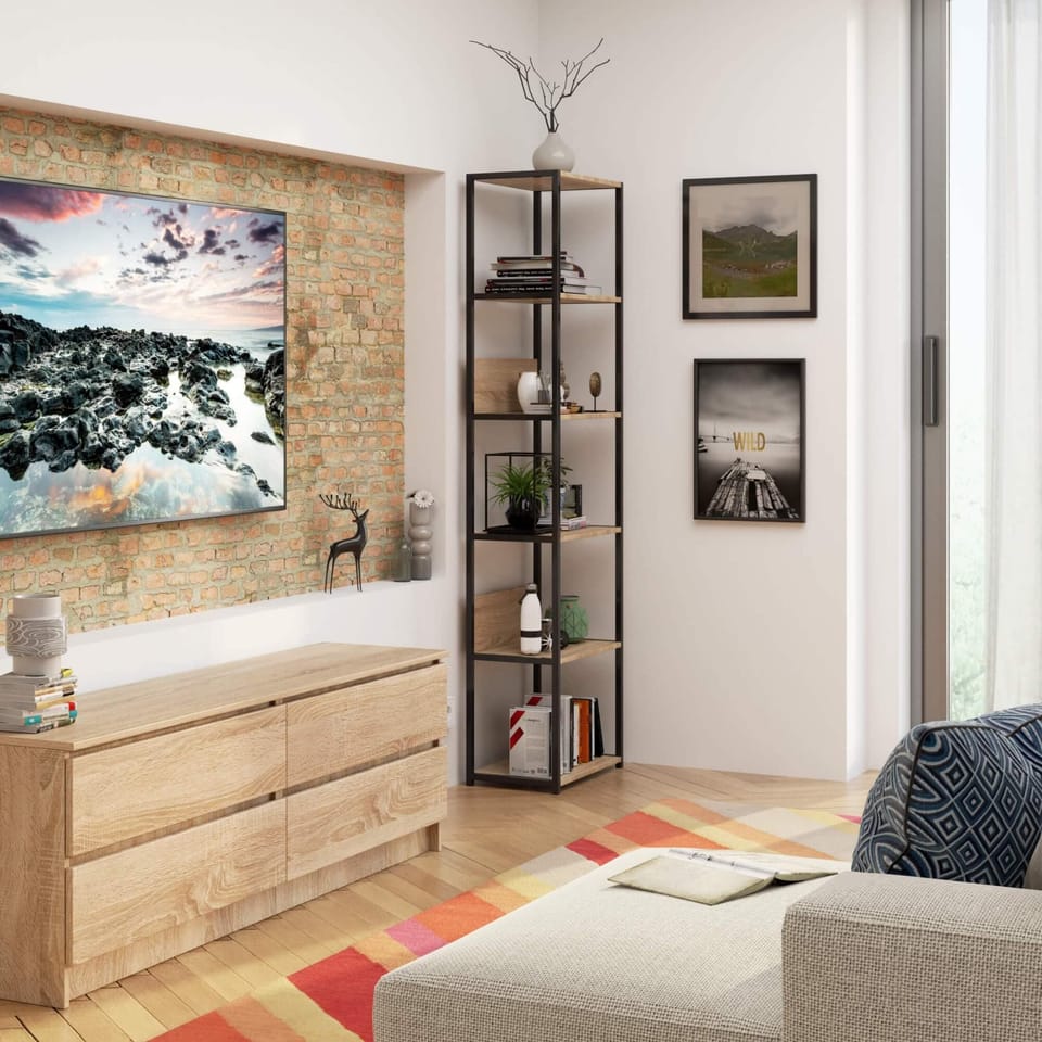 Regał industrialny metalowy to praktyczny i nowoczesny mebel, który sprawdzi się zarówno w salonie jak i biurze. Stelaż w kolorze czarnym. Półki regału zostały wykonane z płyty laminowanej o grubości 16 mm w kolorze dąb sonoma. To trwały i wytrzymały materiał, wyróżniający się wysoką odpornością na ścieranie. Krawędzie zostały dodatkowo zabezpieczone obrzeżem ABS, dzięki czemu mebel cały czas będzie się dobrze prezentował, nawet przy bardzo intensywnym codziennym użytkowaniu. Całość prezentuje się bardzo nowocześnie.