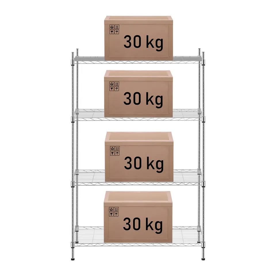Numer producenta: Royal Catering 10011228 Metalowy regał magazynowy marki Royal Catering dzięki całkowitej nośności do 120 kg pozwoli na przechowywanie wielu produktów. Każda z czterech szerokich półek jest w stanie udźwignąć do 30 kg, a odległość między nimi można wygodnie regulować. Całkowita wysokość regału wynosi 137 cm, ale w razie potrzeby można go rozłożyć na dwa mniejsze meble.Otwarta budowa produktu sprawia, że układanie towarów oraz czyszczenie go nie sprawia problemów. Konstrukcja jest wykonana chromowanego metalu. Wykorzystanie tego materiału wpływa na ochronę przed korozją oraz na estetyczny wygląd regału. Montaż mebla jest błyskawiczna i nie wymaga dodatkowych narzędzi. O stabilność całości dbają regulowane nóżki. Cechy produktu: