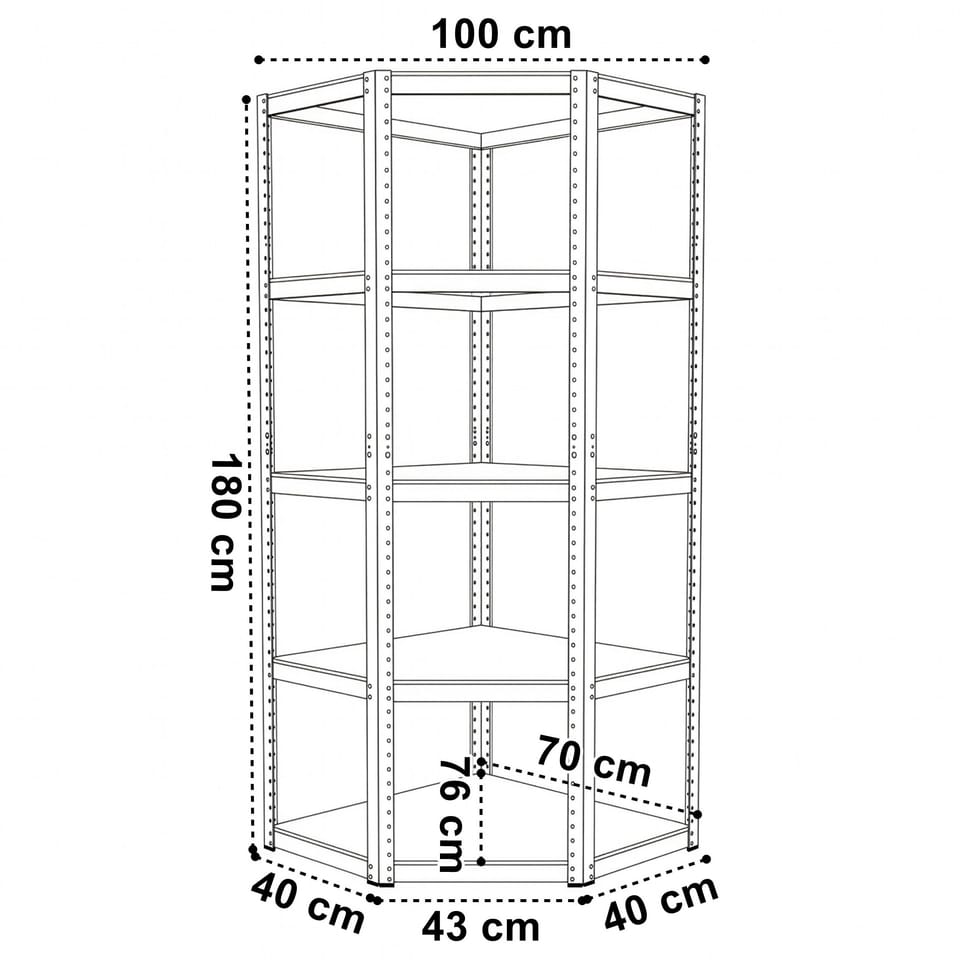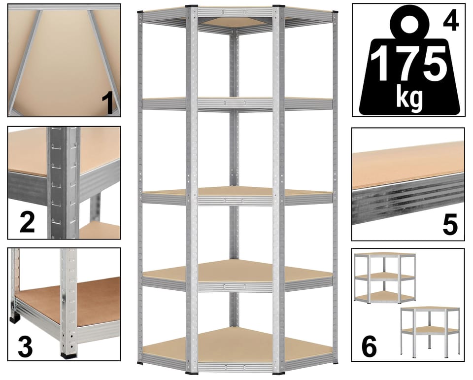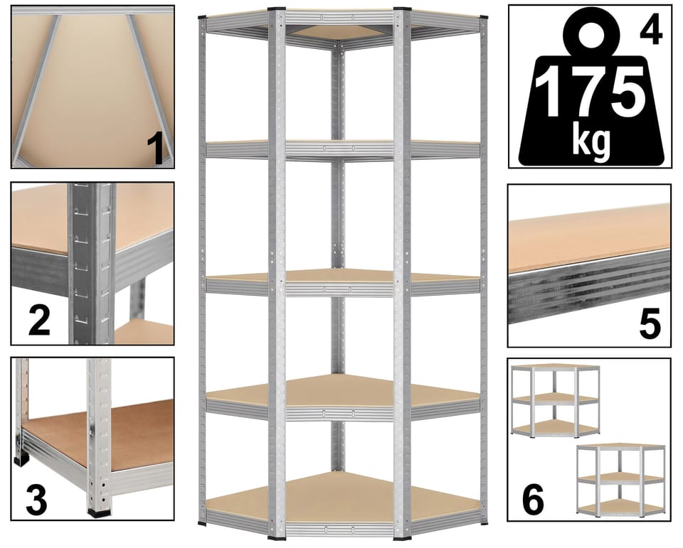 Regał magazynowy narożny 5 poziomów 875 kg 180 x 70 x 40 cm