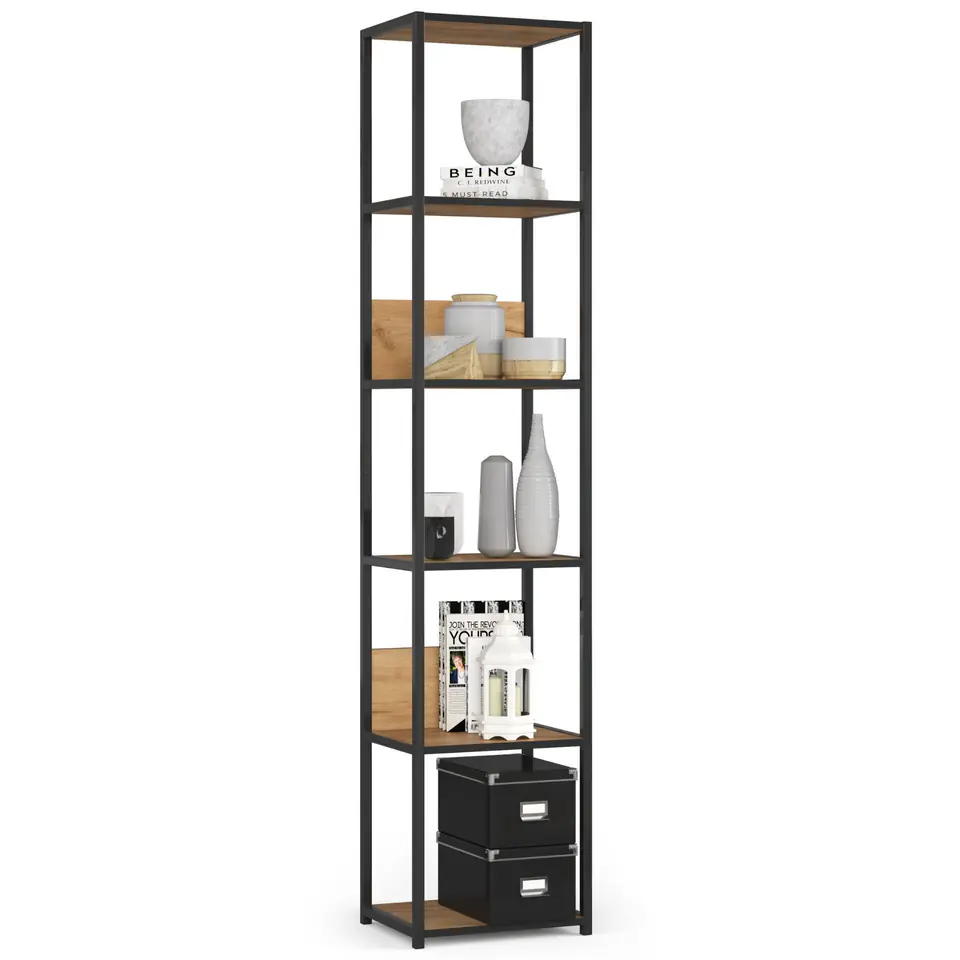 Regał loftowy metalowy to praktyczny i nowoczesny mebel, który sprawdzi się zarówno w salonie jak i biurze. Regał z metalowym czarnym stelażem oraz 6 półkami w kolorze dąb craft. Półki regału zostały wykonane z płyty laminowanej o grubości 16 mm. To trwały i wytrzymały materiał, wyróżniający się wysoką odpornością na ścieranie. Krawędzie zostały dodatkowo zabezpieczone obrzeżem ABS, dzięki czemu mebel cały czas będzie się dobrze prezentował, nawet przy bardzo intensywnym codziennym użytkowaniu. Regał został wyposażony w 6 półek, na których można umieścić przedmioty, które chcemy wyeksponować lub po prostu mieć pod ręką. Całość prezentuje się bardzo stylowo i nowocześnie.