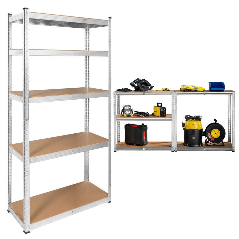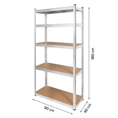 Wymiary: 180 x 90 x 40 cmLiczba półek: 5 szt.Półki z płyty MDFWsporniki środkowe półekProfile galwanizowaneGrubość profili: 0,6 mmNakładki ochronne w zestawie 8 szt.Maksymalne obciążenie półki: 175 kg (przy równomiernym obciążeniu)Maksymalne obciążenie łączne: 875 kgSposób montażu: bezśrubowy (na wcisk)Regał należy przytwierdzić do ścianyKolor: srebrny ocynk