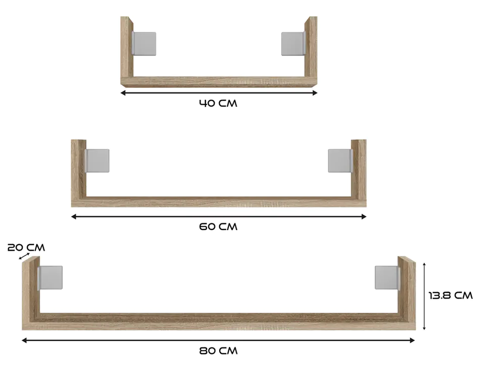 MATERIAŁ: - półki wykonane z płyty meblowej laminowanej o grubości 16 mm WYMIARY: Szerokość: 80 / 60 / 40 cm Wysokość: 14 cm Głębokość: 20 cm Użytkowanie: Powierzchnię mebla czyścić przy pomocy miękkiej szmatki. Unikać stosowania silnie działających środków chemicznych. W opakowaniu: Instrukcja montażu wraz ze wszystkimi potrzebnymi akcesoriami montażowymi. Meble są fabrycznie zapakowane do samodzielnego montażu.Informacja: