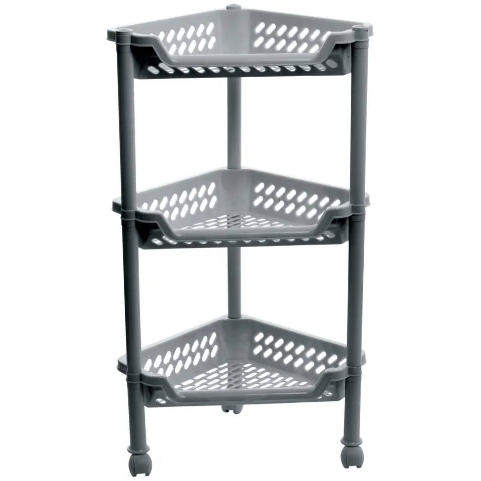 Trójkątny regał idealnie wpasuje się w narożnik pomieszczenia. Regał wyposażony w trzy półki z otworami zapewniającymi lepsze odprowadzanie wody i wentylację w miejscach wilgotnych takich jak łazienka. Regał został wyposażony w kółka ułatwiające przemieszczanie wózka.
