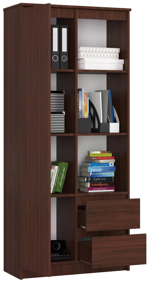 - Regał wykonany z płyty laminowanej 16mm firmy kronospan odpornej na ścieranie- Regał posiada łącznie 6 półek- Szuflady poruszają się na metalowych prowadnicach rolkowych z blokadą wysuwu- Krawędzie oklejone obrzeżem ABS zapewniającym wysoką ochronę na uszkodzenia- Regał wysyłany w paczkach do samodzielnego montażu- Instrukcja w dostawie - Gwarancja 24 miesiące