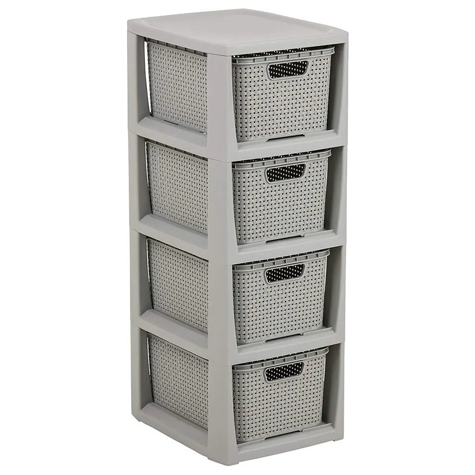 Cechy- Regał BranQ Rattan- Wyposażony w 4 kosze o pojemności 7 litrów- Regał jest bardzo dobrym rozwiązaniem do przechowywania na małych przestrzeniach- Wykonany bardzo estetycznie, z wysokiej jakości, bezpiecznego materiału (wolnego od ftalanów i bpa)- Jest idealny do takich pomieszczeń jak łazienka, garderoba, dziecięcy pokój czy domowe biuro- Produkt polski- Kolor: szary
