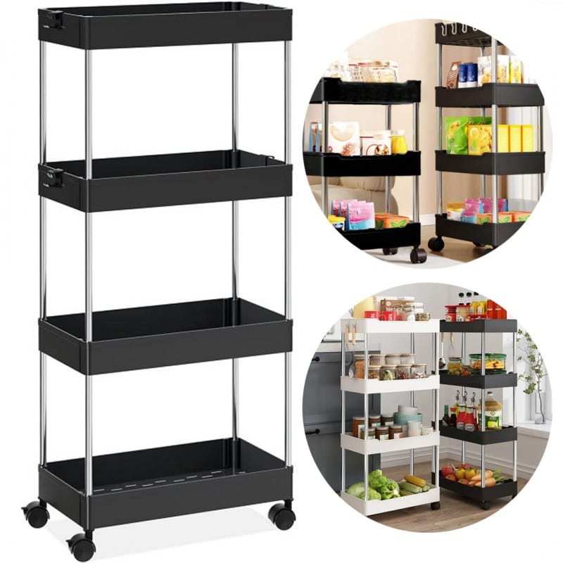 Praktyczny regał, szafka na kółkach Cechy produktu:- Kompaktowy wymiar.- Idealnie sprawdzi się w kuchni lub łazience.- Uniwersalny wygląd sprawia, że wpasuje się w większość wnętrz.- Łatwy w utrzymaniu czystości.- Stabilny i pojemny.- Możliwość zmontowania regału na mniejszą ilość półek, maksymalnie jest 4.- Półki wykonane z tworzywa PP (polipropylen), stelaż ze stopu metali.- Maksymalne łączne obciążenie: 20 kg (5 kg na półkę).- Produkt do samodzielnego montażu. W skład regału wchodzą:4x półka4 x haczyk12x wspornik4x kółka Wymiary:- Szerokość: 38 cm- Wysokość: 88 cm- Głębokość: 20,5 cmWymiary jednostkowe opakowania: 39,5 x 22 x 21 cm, waga: 1,2 kg