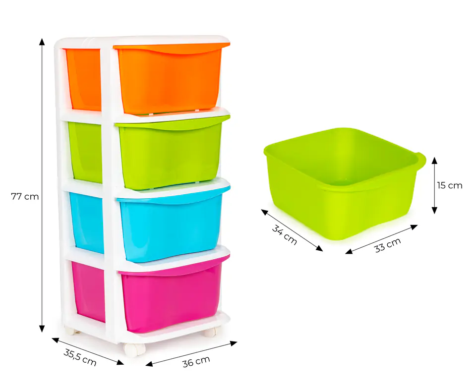 Regał składa się z czterech kolorowych szuflad ze specjalnie wyprofilowanym uchwytem na froncie, co ułatwi Ci ich wsuwanie i wysuwanie.