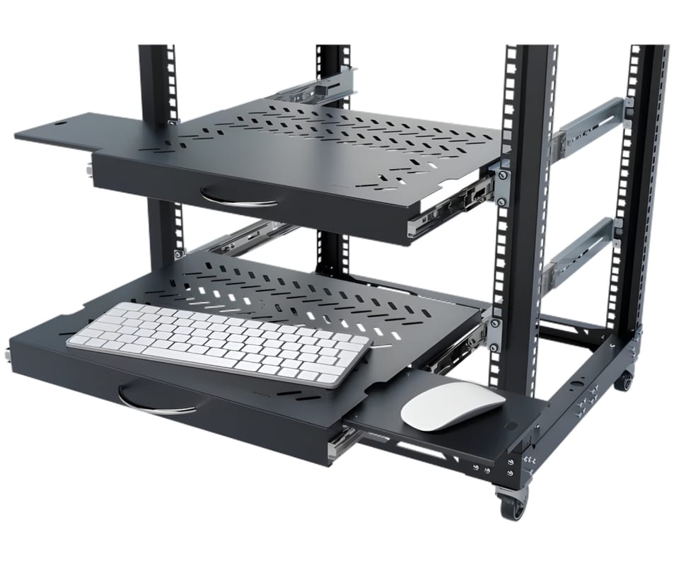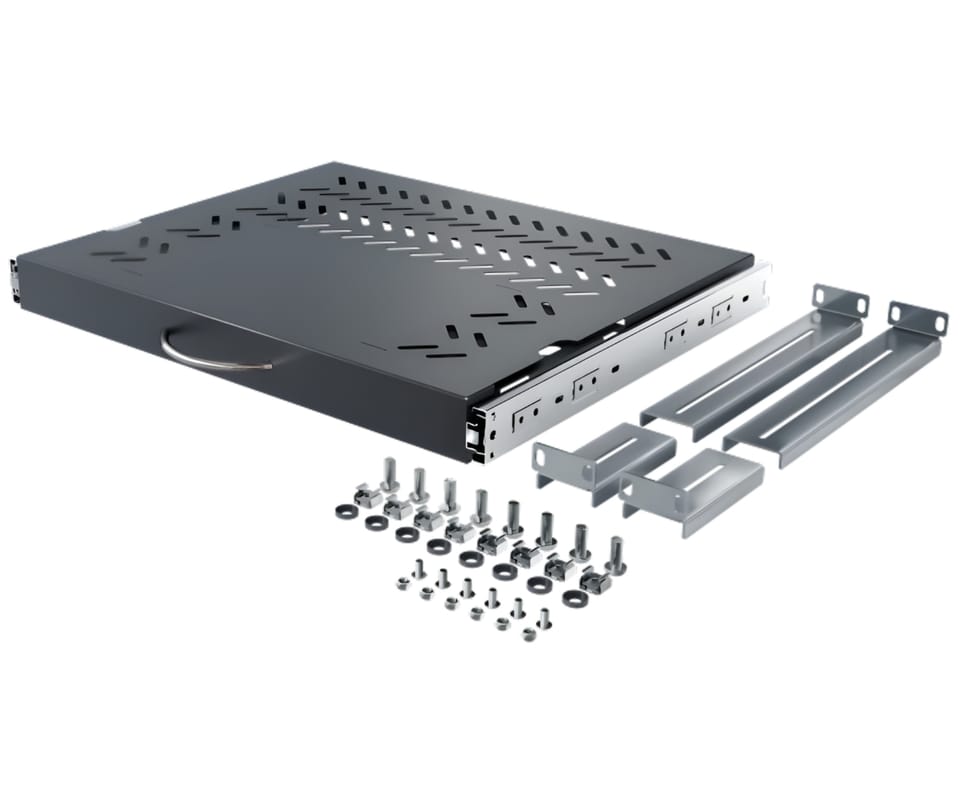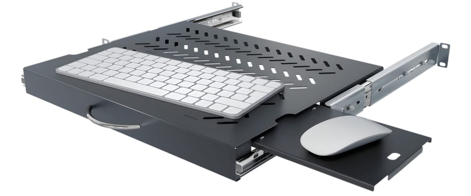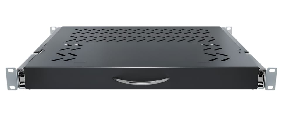 Szuflada RACK RSR-F2-19-1U-350B-KM pod klawiaturę i myszkę to wysuwana półka 19" w kolorze czarnym, przeznaczona do wygodnej obsługi urządzeń w szafach rack. Solidna metalowa konstrukcja i mechanizm wysuwu zapewniają stabilność oraz komfort pracy serwisowej. Idealnie sprawdzi się w serwerowniach i instalacjach teletechnicznych, gdzie liczy się ergonomia i porządek.