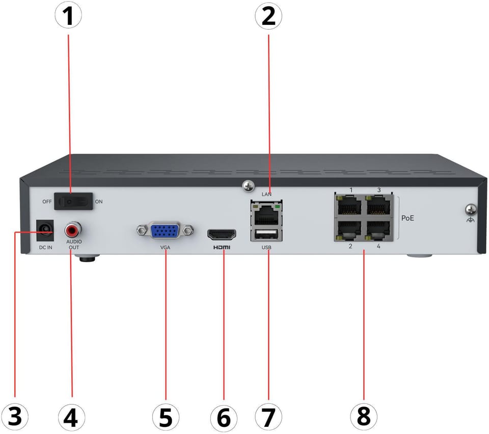 - Obsługa do 4 kamer PoE — zasilanie i transmisja danych jednym przewodem, instalacja bez zbędnych kabli.
