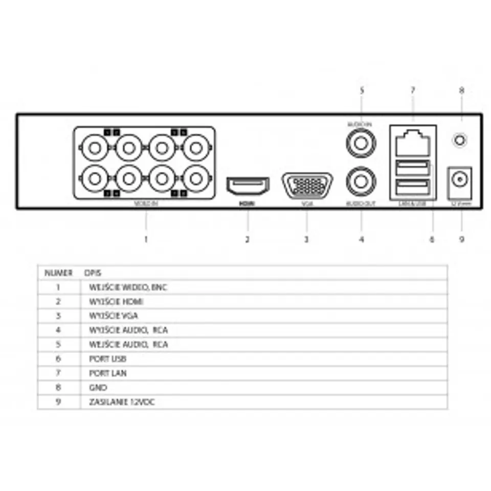 Rejestrator HQ-THD0801KL-C obsługuje kamery Turbo HD (HDTVI), HDCVI, AHD, CVBS oraz kamery IP. Obsługuje porty wyjściowe VGA i HDMI umożliwiając tym samym wyświetlanie obrazu na zwykłym monitorze w rozdzielczości FullHD 1080p. Zapis obrazu w rozdzielczości nawet 3Mpx* dla Turbo HD pozwala uzyskać bardzo wysoką jakość nagrań przy korzystaniu ze standardowych analogowych instalacji.Umożliwia nagrywanie dźwięku poprzez kabel koncentryczny (wymagane kamery obsługujące technologię Audio via coaxial) a także posiada jedno wejście audio umożliwiając zapis sygnału dźwiękowego z mikrofonu dla pierwszego kanału.Tryb pracy pentaplex oraz intuicyjne menu w języku polskim sprawia, że korzystanie z funkcji rejestratora jest łatwe i wygodne. Rejestrator może obsługiwać dysk SATA max. 6TB i posiada rozbudowane opcje wyszukiwania nagranego materiału wideo. Pliki wideo z dysku twardego mogą być kopiowane na przenośną pamięć USB i odtwarzane na dowolnym komputerze PC.Dostęp przez sieć internetową IP realizowany jest poprzez przeglądarkę internetową lub dedykowany program, a także z platform mobilnych z wykorzystaniem specjalnych aplikacji (Android, iOS). Użytkownik może podglądać „na żywo” obrazy z kamer oraz odtwarzać i zapisywać nagrania na dysk swojego komputera. Obsługa połączeń P2P zapewnia zdalny dostęp oraz łatwą i szybką konfigurację niezależnie od łącza internetowego. Możliwa jest również zdalna konfiguracja rejestratora poprzez sieć TCP/IP* obsługa rozdzielczości 3Mpx możliwa jest tylko na kanale 1 i 2. Specyfikacja techniczna: SystemWejścia VIDEO IN8 x BNC (1Vp-p 75Ω) PAL, obsługa technologii Audio via coaxialObsługiwane kamery Turbo HD (HDTVI)4MP, 3Mpx*, 1080p25, 1080p30, 720p25, 720p30, 720p50, 720p60*obsługa rozdzielczości 3Mpx możliwa jest tylko na kanale 1 i 2.Obsługiwane kamery AHD4MP, 1080p25, 1080p30, 720p25, 720p30Obsługiwane kamery HDCVI4MP, 1080p25, 1080p30, 720p25, 720p30Obsługa kamer analogowychCVBSObsługa kamer IP4 kanały do 6Mpx każdy (kamery HQ, obsługa Onvif), kompresja: H.265+, H.265, H.264+, H.264Wyjścia HDMI/VGA1x VGA / HDMI (1920x1080/60Hz, 1280x1024/60Hz, 1024x768/60Hz, 1280x720p/60Hz) AudioWejścia AUDIO IN1 x RCA (Linear, 2Vp-p, 1kΩ), wejście nr.1 może być używane do dwukierunkowej transmisji audioWyjścia AUDIO OUT1 x RCA (Linear, 2Vp-p, 1kΩ)Nagrywanie dźwiękuG.711u 64Kbps, obsługa technologii Audio via coaxial NagrywanieKompresja wideoH.265 Pro+, H.265 Pro, H.265, H.264+, H.264Rozdzielczość nagrywaniaTryb 1080p lite włączony: 4MP/3Mpx*/1080p lite /720p lite /VGA/WD1/4CIF/CIF/QVGA/QCIFTryb 1080p lite wyłączony: 4MP/3Mpx*/1080p/720p/VGA/WD1/4CIF/CIF/QVGA/QCIF*obsługa rozdzielczości 3Mpx możliwa jest tylko na kanale 1 i 2.Parametry nagrywania(główny strumień)Tryb 1080p lite włączony: - 4MP lite/1080p lite /720p lite/VGA/WD1/4CIF/CIF/QVGA/QCIF po 25kl/sTryb 1080p lite wyłączony:- strumień 4Mpx: 4MP lite po 15kl/s, 1080p lite/720p/VGA/WD1/4CIF/CIF po 25kl/s- strumień 3Mpx: 3 Mpx*/1080p/720p/VGA/WD1/4CIF/CIF po 15kl/s- strumień 1080p: 1080p/720p 15kl/s; VGA/WD1/4CIF/CIF po 25kl/s- strumień 720p: 720p/VGA/WD1/4CIF/CIF po 25kl/s*obsługa rozdzielczości 3Mpx możliwa jest tylko na kanale 1 i 2.Rozdzielczość - kanały IP4 kanały IP do 6Mpx każdy (kamery HQ, również obsługa innych kamer przez ONVIF)Extra strumieńWD1/4CIF/2CIF 12kl/s, CIF/QVGA/QCI po 25kl/s na kanałVideo Bitrate32Kbps - 6MbpsTryb pracyPentapleks – Podgląd, Nagrywanie, Odtwarzanie/Archiwizacja, Zdalny podgląd, Zdalne Odtwarzanie/Archiwizacja Dyski twardeInterfejsSATAMaks. ilość HDD1 x HDD SATAMaks. pojemność HDDmaks. 6TB OdtwarzanieTryb odtwarzaniaZmienne prędkości odtwarzania, Pauza, Przewijanie, Jednoczesne odtwarzanie kilku kanałówWyszukiwanie nagrańNumer kanału, Data, Czas, Kalendarz, Zdarzenie, Znacznik (Tag) Praca sieciowaFunkcjeTCP/IP, PPPoE, DHCP, DNS, P2P, DDNS, NTP, SADP, SNMP, NFS, iSCSI, UPnP™, HTTPS, OnvifInterfejsPort RJ-45 (10/100Mb/s)Zdalna obsługaVMS, Przeglądarka internetowa, mobilny (Android, iOS) InneInterfejsy2 x USB 2.0Zasilanie12VDCPobór mocy (bez HDD)≤ 12 WTemp. pracy / wilgotność powietrza-10 °C ~+55 °C / 10% ~ 90%Wymiary [mm]200x200x45 mm Masa (bez HDD)1kg