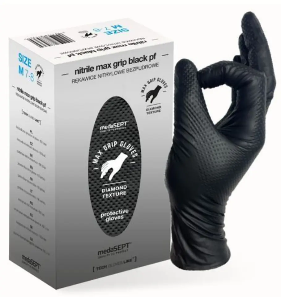 Rękawice nitrylowe w kolorze czarnym, ochronne, bezpudrowe, niejałowe, do jednorazowego użytku.