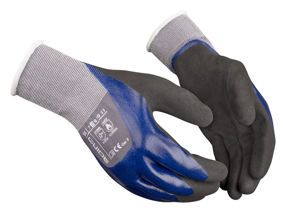 Cienka, miękka rękawica montażowa. Kciuk zanurzeniowo powleczony nitrylem i podwójna powłoka na obszarze dłoni. Odporna na oleje i ciecze.