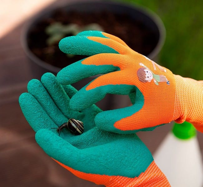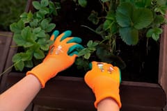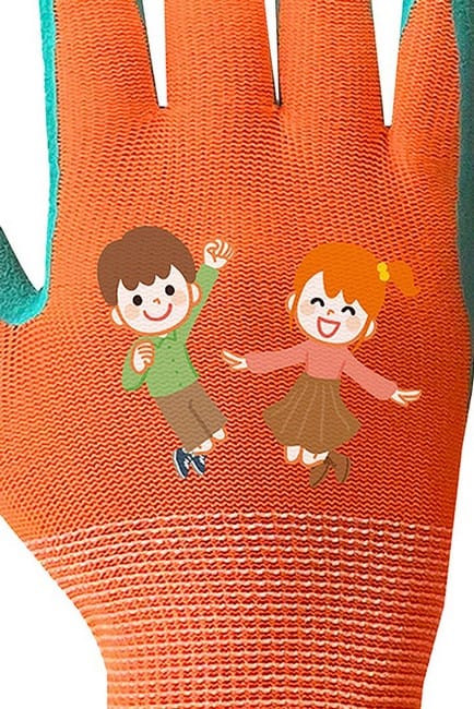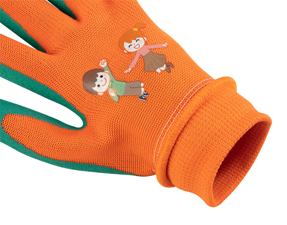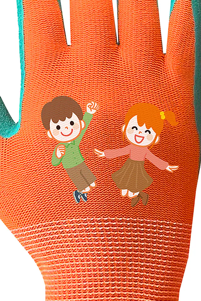Rękawice robocze dla dzieci, rozmiar 3, materiał główny: poliester, pokrycie: lateks (crincle), kategoria I, oddychająca zewnętrzna tkanina, dobre dopasowanie do dłoni, zakończone ściągaczem, na zewnętrznej części nadruk podskakujących z radości dzieci, certyfikat CE