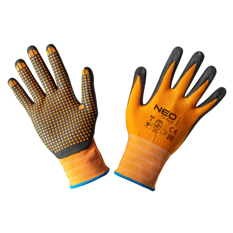 Rękawice robocze, nylonowe, pokryte kropkami z nitylu, 4131X, rozmiar 9, materiał główny: nylon, pokrycie: nitryl i kropki nitrylowe, odporność na ścieranie (od 0 do 4) 4, odporność na przecięcie ostrym przedmiotem (od 0 do 5) 1, odporność na rozdzieranie (od 0 do 4) 3, odporność na przekłucie (od 0 do 4) 1, odporność na przecięcie wg EN ISO 13997 X, dobre dopasowanie do dłoni, zastosowanie: wszelkie prace transportowe, przenoszenie, magazynowanie, składowanie, prace montażowe, produkcja drobnych elementów, majsterkowanie, motoryzacja, ogrodnictwo, certyfikat CE na zgodność z normą EN 388