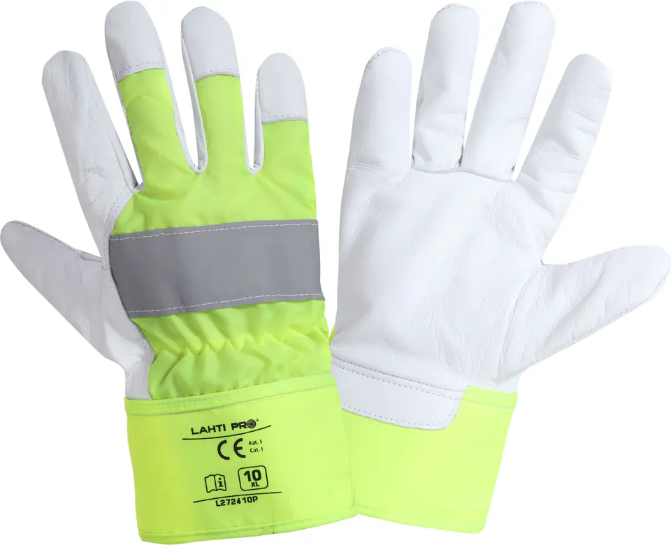 - Wierzchnia część rękawicy z materiału o podwyższonej widzialności w połączeniu z pasem odblaskowym podnoszą widoczność użytkownika. Wykonanie części chwytnej z jednego kawałka skóry zwiększa trwałość rękawicy.