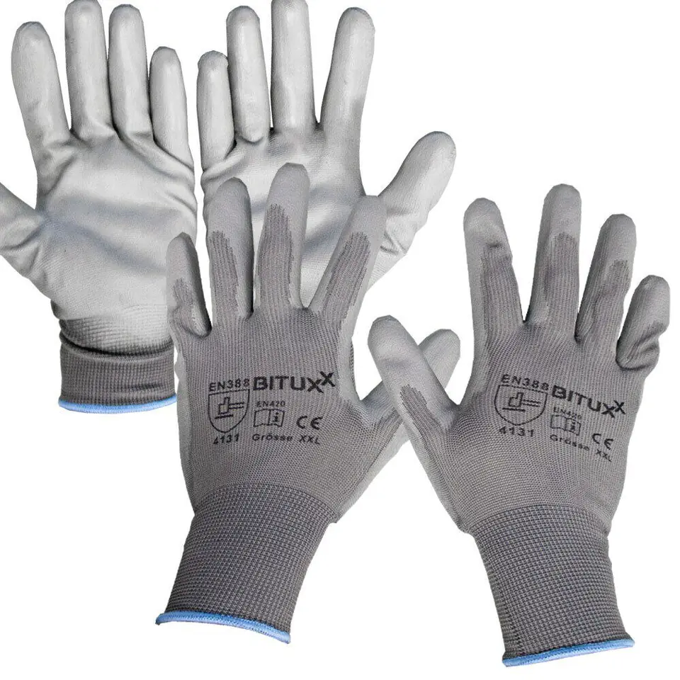 Rękawice robocze cenionej, niemieckiej marki BITUXX wykonane z poliestru z powłoką PU idealnie dopasowują się do dłoni i są wygodne w noszeniu.