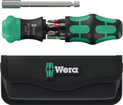 Rękojeść Kraftform z uchwytem do bitów 1/4". Drobnozębna grzechotka zintegrowana z rękojeścią zapewnia szybką pracę. Intuicyjna zmiana kierunku pracy: obrót pierścienia przełączającego w prawo powoduje zmianę kierunku pracy w prawo, obrót pierścienia przełączającego w lewo powoduje zmianę kierunku pracy w lewo. Mechanizm zapadkowy można zablokować w pozycji 0 dla zapewnienia precyzyjnej pracy. Zestaw zawiera 6 bitów 6 BiTorsion charakteryzujących się długą żywotnością, wytrzymałych, do uniwersalnego zastosowania, przechowywanych w magazynku na bity wbudowanym w rękojeści. Silny magnes stały w uchwycie do bitów 1/4" zapewnia ich niezawodne mocowanie. 2-komponentowa rękojeść Kraftform z kombinacją strefy twardej i miękkiej umożliwia pewny chwyt i precyzyjną pracę. Wytrzymałe składane etui, które można przymocować do systemu do transportu narzędzi Wera 2go lub do ścianki, półki lub wózka warsztatowego za pomocą dołączonego samoprzylepnego paska z rzepem