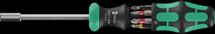 Rękojeść Kraftform z uchwytem do bitów 1/4". Drobnozębna grzechotka zintegrowana z rękojeścią zapewnia szybką pracę. Intuicyjna zmiana kierunku pracy: obrót pierścienia przełączającego w prawo powoduje zmianę kierunku pracy w prawo, obrót pierścienia przełączającego w lewo powoduje zmianę kierunku pracy w lewo. Mechanizm zapadkowy można zablokować w pozycji 0 dla zapewnienia precyzyjnej pracy. Zestaw zawiera 6 bitów 6 BiTorsion charakteryzujących się długą żywotnością, wytrzymałych, do uniwersalnego zastosowania, przechowywanych w magazynku na bity wbudowanym w rękojeści. Silny magnes stały w uchwycie do bitów 1/4" zapewnia ich niezawodne mocowanie. 2-komponentowa rękojeść Kraftform z kombinacją strefy twardej i miękkiej umożliwia pewny chwyt i precyzyjną pracę.