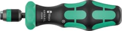 Wysokiej jakości rękojeść z uchwytem do bitów z funkcją grzechotki. Drobnozębna grzechotka zintegrowana z rękojeścią zapewnia szybką pracę. Innowacyjny mechanizm zapadkowy umożliwia "pokręcanie", gdy śruba stawia niewielki opór. Intuicyjna zmiana kierunku pracy: obrót pierścienia przełączającego w prawo powoduje zmianę kierunku pracy w prawo, obrót pierścienia przełączającego w lewo powoduje zmianę kierunku pracy w lewo. Mechanizm zapadkowy można zablokować w pozycji 0 dla zapewnienia precyzyjnej pracy. Uchwyt szybkowymienny Rapidaptor (odpowiedni do bitów z sześciokątnych 1/4" według DIN ISO 1173-C 6.3 i E 6.3 (ISO 1173)) umożliwia błyskawiczną wymianę bitów bez użycia dodatkowych narzędzi. Silny magnes trwały gwarantuje niezawodne przytrzymanie bitów. Ergonomicznie zaprojektowana rękojeść Kraftform zapobiega powstawaniu pęcherzy i odcisków na dłoni. Strefy chwytu wykonane z twardego materiału umożliwiają szybkie uchwycenie bez "przyklejania się" do dłoni, a tym samym wysoką prędkość roboczą, podczas gdy str