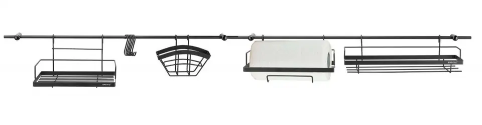 W zestawie: wieszak na ręczniki kuchenne z podajnikiem, 2 półki na przyprawy kuchenne, 6 wieszaków na narzędzia kuchenne, koszyk na serwetki/ filtry do kawy, 4 uchwyty mocujące, 2 rurki ze stali nierdzewnej. Całość wykonana ze stali lakierowanej w kolorze czarnym. Możliwość dowolnej konfiguracji.