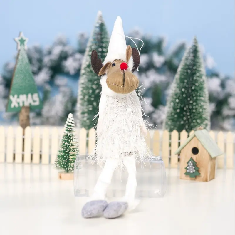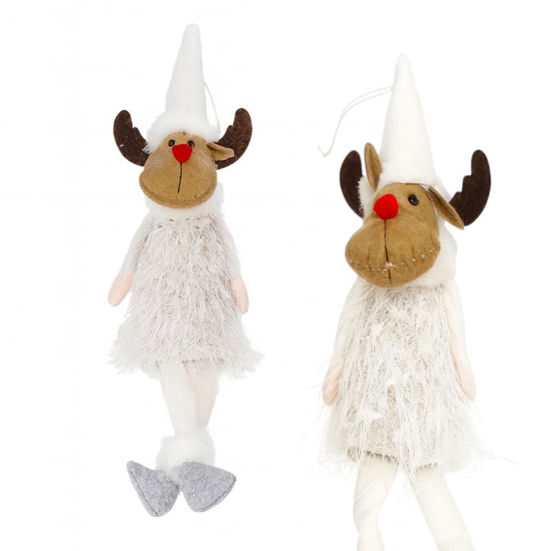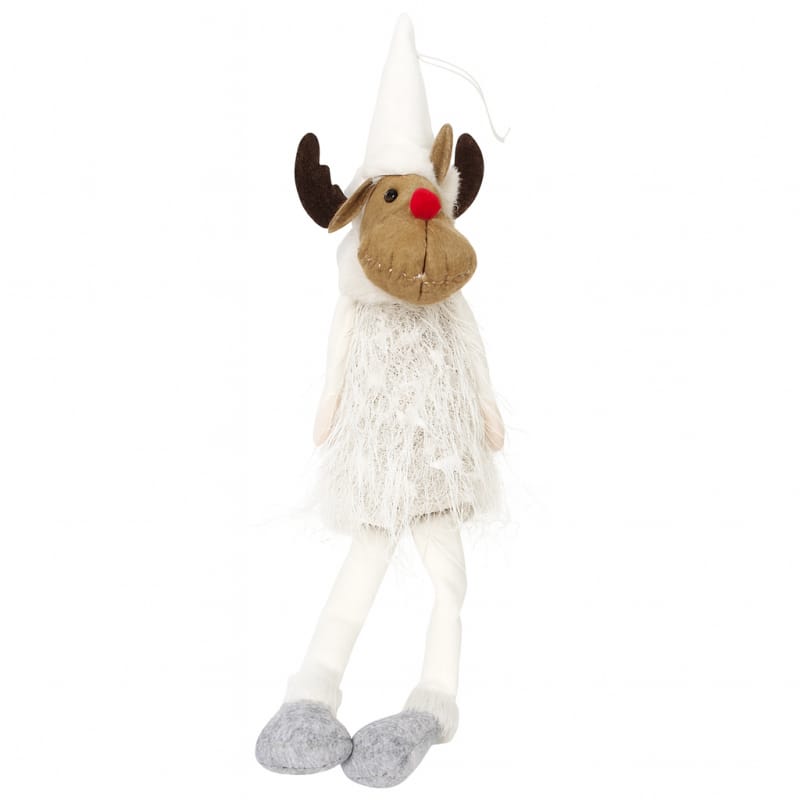 Siedzący renifer z wiszącymi nóżkamiWypełniony pluszemDla stabilizacji pozycji stojącej w tułowiu posiadają piasek - co dodatkowo je obciążaFigurki ze sznurkiem - można je powiesićWaga: 82 gWymiary:Wysokość maksymalna : 37 cm Szerokość: 9 cm