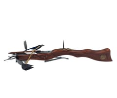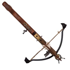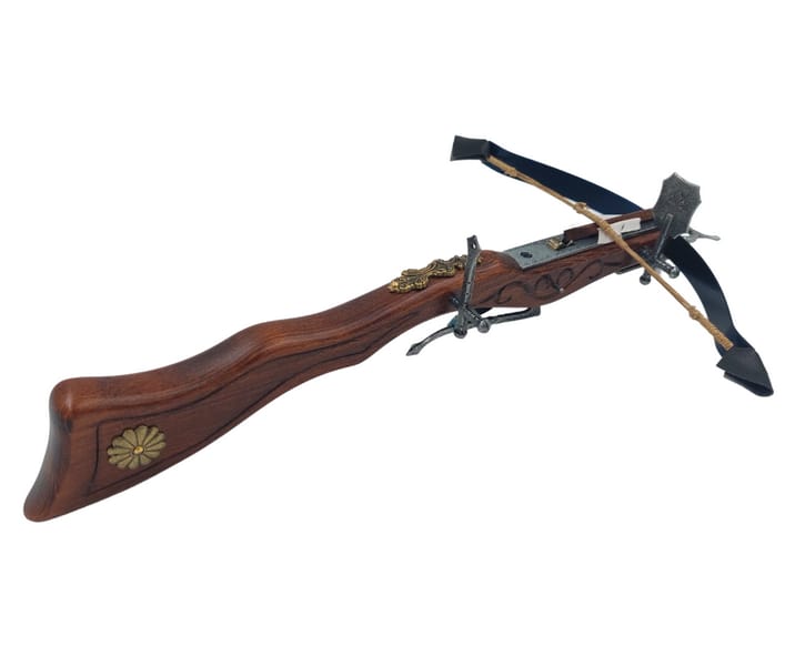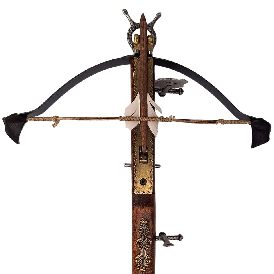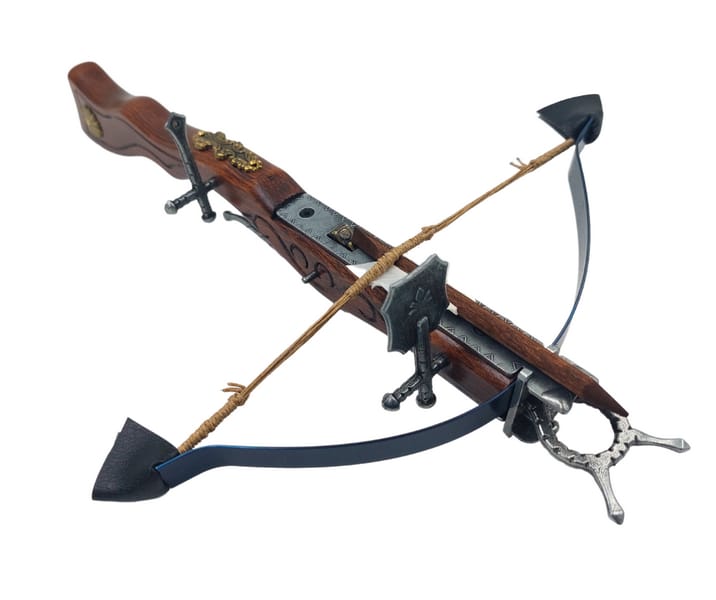Replika Kuszy - 0F Replika Kuszy – 0F to fascynujący i precyzyjnie wykonany przedmiot, który przeniesie Cię do czasów wielkich potyczek wojennych. Ta wierna replika kuszy, używanej między XV a XVI wiekiem zachwyca swoim wykonaniem i historycznym wdziękiem. To znakomity pomysł na prezent dla miłośników historii oraz kolekcjonerów militariów. Replika Kuszy – 0F to połączenie historii, sztuki i precyzyjnego rzemiosła, które z pewnością zachwyci każdego, kto ją otrzyma. Informacje o produkcie: ·Wymiary: 38 x 20 cm ·Waga: 0,27 kg ·Wykonana z solidnego drewna, ręcznie zdobiona. ·Łuk kuszy wykonany ze stali nierdzewnej ·Bełt z naturalnymi piórami nadaje jej autentycznego wyglądu ·Błyszczące metalowe elementy dodają jej elegancji i nadają blasku każdemu pomieszczeniu. ·Wiernie odwzorowana ·Uwaga: Kusza nie strzela! Ten produkt jest dekoracją kolekcjonerską. To nie jest zabawka. Chronić przed dziećmi.