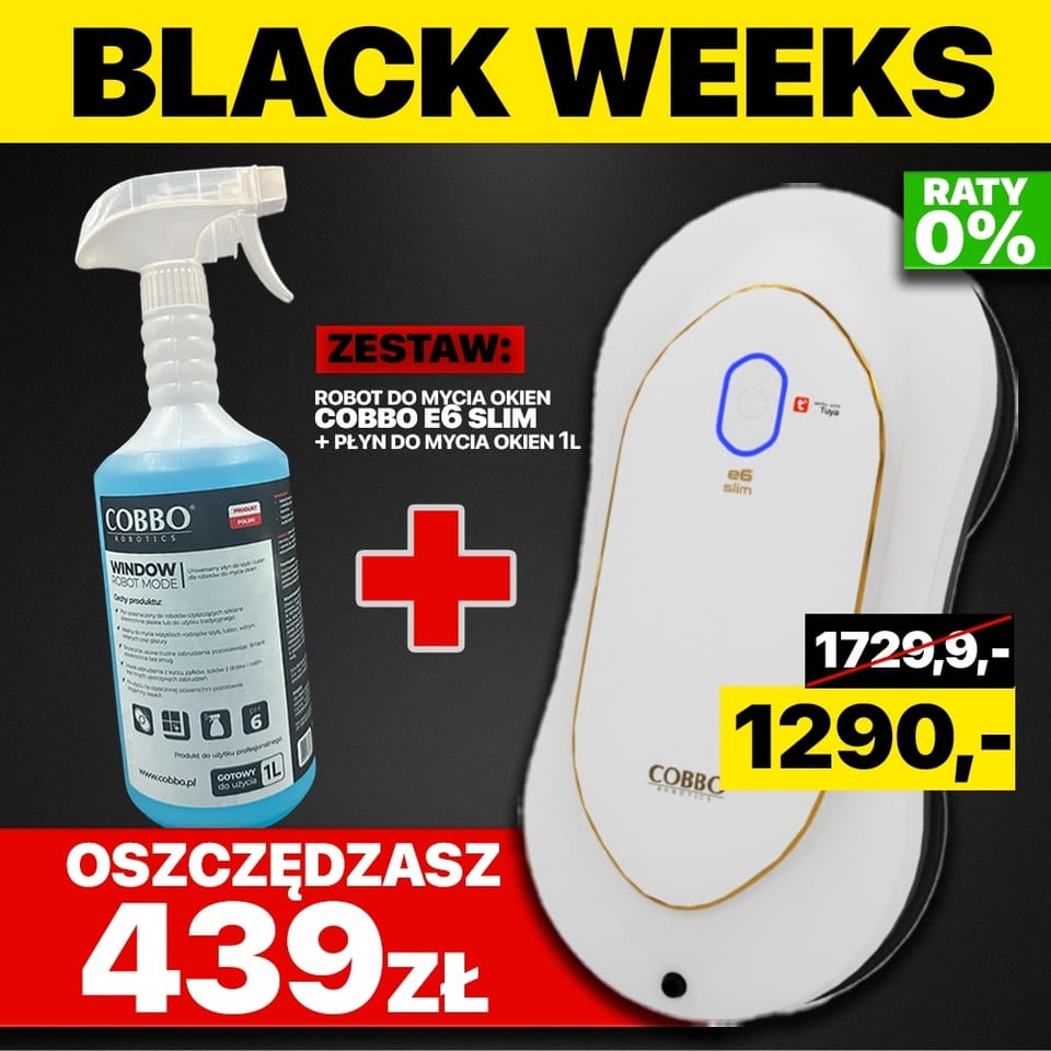 Poznaj COBBO E6 Slim, bestsellerowy robot do mycia okien który wyróżnia się tym, co naprawdę ma znaczenie: skutecznością, prostotą obsługi i unikalną technologią spryskiwania dwustronnego. Dzięki systemowi Anti-Wind SprayTM i inteligentnej nawigacji, E6 Slim myje szybciej, dokładniej i bez smug – nawet wtedy, gdy inne roboty zawodzą. To sprawdzony wybór dziesiątek tysięcy użytkowników w Polsce – z oceną 4,89/5 na Allegro i 4,8/5 na Ceneo.