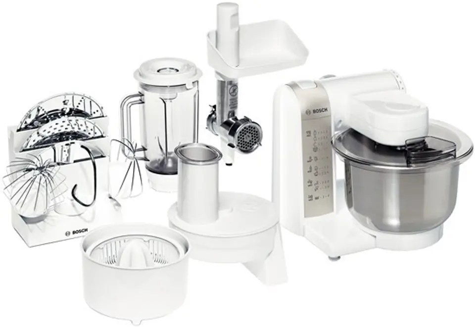 Robot kuchenny MUM 4880 marki Bosch, o mocy 600 W, z 4 prędkościami pracy. Model ten posiada w wyposażeniu między innymi: mikser kielichowy o pojemności 1 l, wyciskarkę do cytrusów, maszynkę do mielenia, 3 tarcze tnące oraz trzepaczkę do ubijania. Urządzenie posiada także zabezpieczenie przed przeciążeniem, uchwyt do akcesoriów oraz schowek na przewód zasilający.