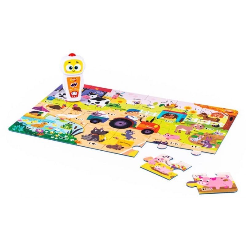 Robot Robby - Farma i Las Robot Robby zaprasza na zabawę w układanie i odkrywanie! Pierwszy etap zabawy polega na ułożeniu dwóch obrazków ze znajdujących się w zestawie puzzli. Gdy już maluch upora się z tym zadaniem, do gry „wkroczy" wesoły robocik, który przygotował dla najmłodszych ponad 350 dźwięków i aż 16 różnych gier, a wśród nich szukanie zwierzątek na obrazku, dopasowywanie ich odgłosów, odtwarzanie sekwencji i rozpoznawanie domków zwierzaków. Dźwięki pochowane są w 32. aktywnych polach, oznaczonych kodem kreskowym. Aby robot prawidłowo odczytał pole, należy delikatnie przycisnąć końcówkę robota do kodu kreskowego, umieszczając robota pionowo nad polem. Cechy produktu: - 24 i 35 puzzli (do ułożenia dwóch obrazków); - ponad 350 piosenek, dźwięków i zwrotów; - 3 tryby zabawy: odgłosy zwierząt, piosenki i wierszyki, powtarzaj za zwierzątkami; - 16 trybów gry: 1) znajdź zwierzątko na farmie / 2) w lesie, 3) rozpoznaj odgłos zwierzątka na farmie / 4) w lesie, 5) o jakie wiejskie / 6) leśne zwierzątko chodzi?, 7) znajdź wiejskie / 8) leśne zwierzątko z rymowanki, 9) znajdź domek zwierzątka, 10) połącz dziecko z rodzicem, 11) odtwórz sekwencję na farmie / 12) w lesie, 13) znajdź wiejskie / 14) leśne zwierzątko z piosenki, 15) które wiejskie / 16) leśne zwierzątko tak robi? - 32 aktywne pola; - aby robot działał prawidłowo, przykładaj go pionowo do kodów kreskowych; - zabawka mówi po polsku; - wyłącznik dźwięku; Baterie: 2 x AAA (zawarte w zestawie) Wiek: 3+