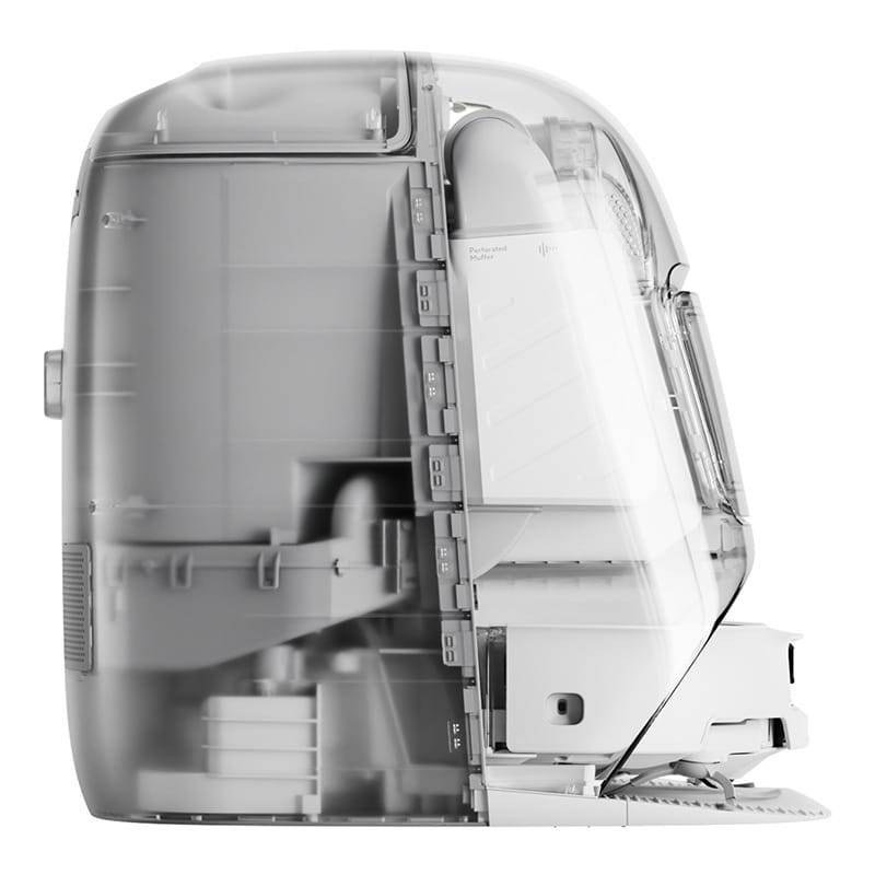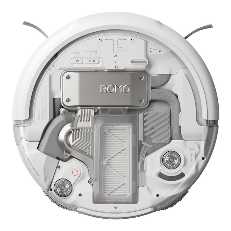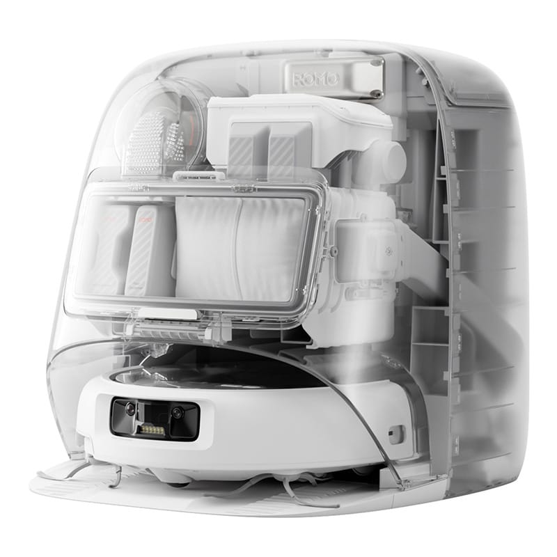 DJI ROMO P i jego stacja wyróżniają się eleganckim designem – przezroczyste elementy obudowy pozwalają zajrzeć do środka i zobaczyć technologię w akcji. Urządzenie jest nie tylko funkcjonalne, ale również estetyczne – świetnie wpisze się w każdy nowoczesny dom.