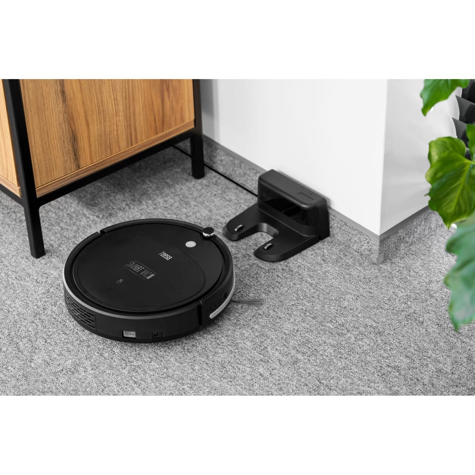 ----------GŁÓWNE CECHY----------Przeznaczony do większości rodzajów podłóg twardych oraz dywanów z krótkim włosiemZmywalny filtr HEPA 3 tryby sprzątania Dwie szczotki boczneCzujnik uskoku podłożaWskaźnik ładowaniaPowiadomienia głosoweAutomatyczny powrót do stacji i ładowaniePokonywanie przeszkód do 1,2 cmNiski profil (7,7 cm)Gumowy zderzakSterowanie za pomocą pilota (2x bateria AAA, brak w zestawie)----------DANE TECHNICZNE----------Moc ssania: 1000 Pa (2 poziomy)Filtr: HEPA 11Pojemność pojemnika na kurz: 200 mlObszar sprzątania: 90 m2Czas pracy: 70 – 90 minCzas ładowania: około 4 – 6 godzinPoziom głośności: 52 dBW zestawie: pilot, 2 pary szczotek bocznych, pędzelek do czyszczenia, stacja dokująca, zasilacz sieciowyWaga: 1,6 kgWymiary (średnica x wysokość): 28 x 7,7 cm----------ZASILANIE----------Moc: 15 WAkumulator: 9,6 V; 2000 mAhZasilacz sieciowy:• Wejście: 100 – 240 V~; 50/60 Hz• Wyjście: 12 V / 580 mA