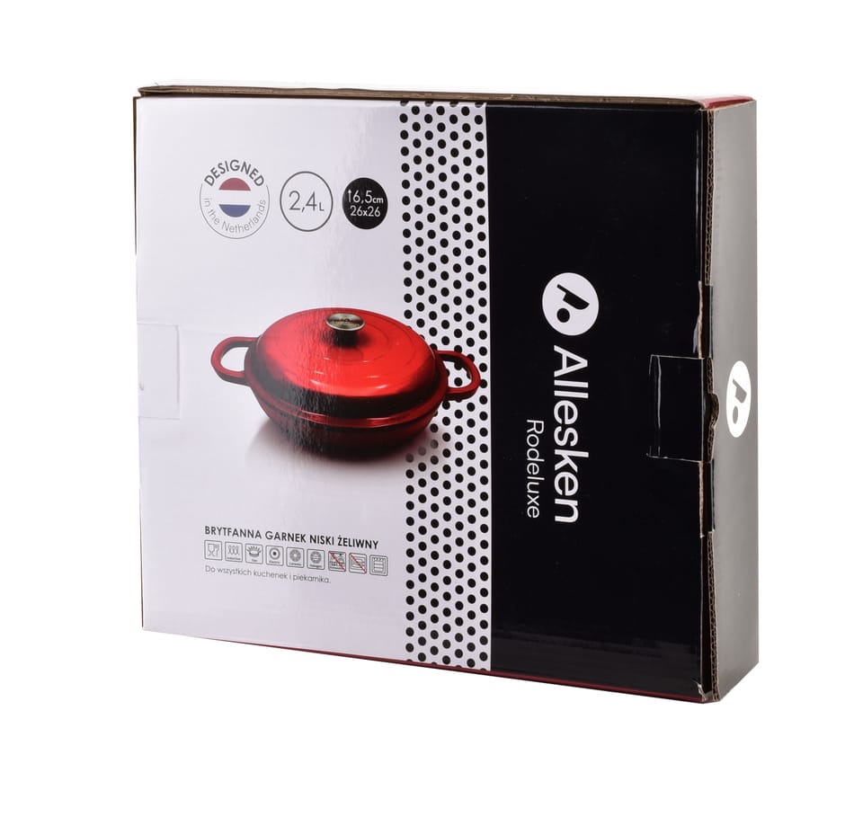 Gęsiarka żeliwna w kolorze czerwonym z serii RODELUXE to wysokiej jakości naczynie kuchenne, które jest idealne do przygotowywania różnorodnych potraw, w szczególności duszonych mięs, zapiekanek oraz pieczeni. Oto kilka cech charakterystycznych takiej gęsiarki: Materiał: Wykonana z solidnego żeliwa, które zapewnia równomierne rozprowadzanie ciepła oraz długotrwałe utrzymywanie temperatury. Kolor: Elegancki czerwony kolor, który dodaje stylu każdej kuchni. Pokrywa: Żeliwna pokrywa zapewniająca szczelność oraz optymalne warunki do duszenia potraw. Rączki: Ergonomiczne uchwyty ułatwiające przenoszenie naczynia, nawet gdy jest gorące. Seria RODELUXE: Charakteryzuje się wyjątkowym designem oraz najwyższą jakością wykonania.Takie naczynie jest nie tylko funkcjonalne, ale również stanowi piękny element wyposażenia kuchni. Idealne dla miłośników gotowania, którzy cenią sobie trwałość i estetykę swoich narzędzi kuchennych.wymiar: 26x26xh11cm z pokrywąwaga:4,268kgzapakowana jednostkowo w color box: 29x32xh7cm