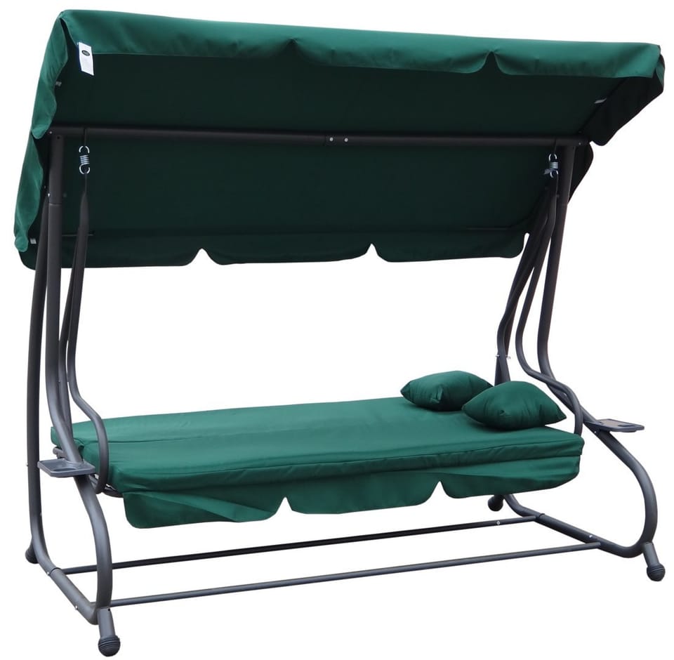 Rodzinna Huśtawka ogrodowa z Daszkiem Zielony + Tekstylina 2x1 + Regulowane siedzisko + Materac + 2 Podstawki na napoje