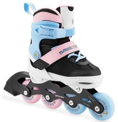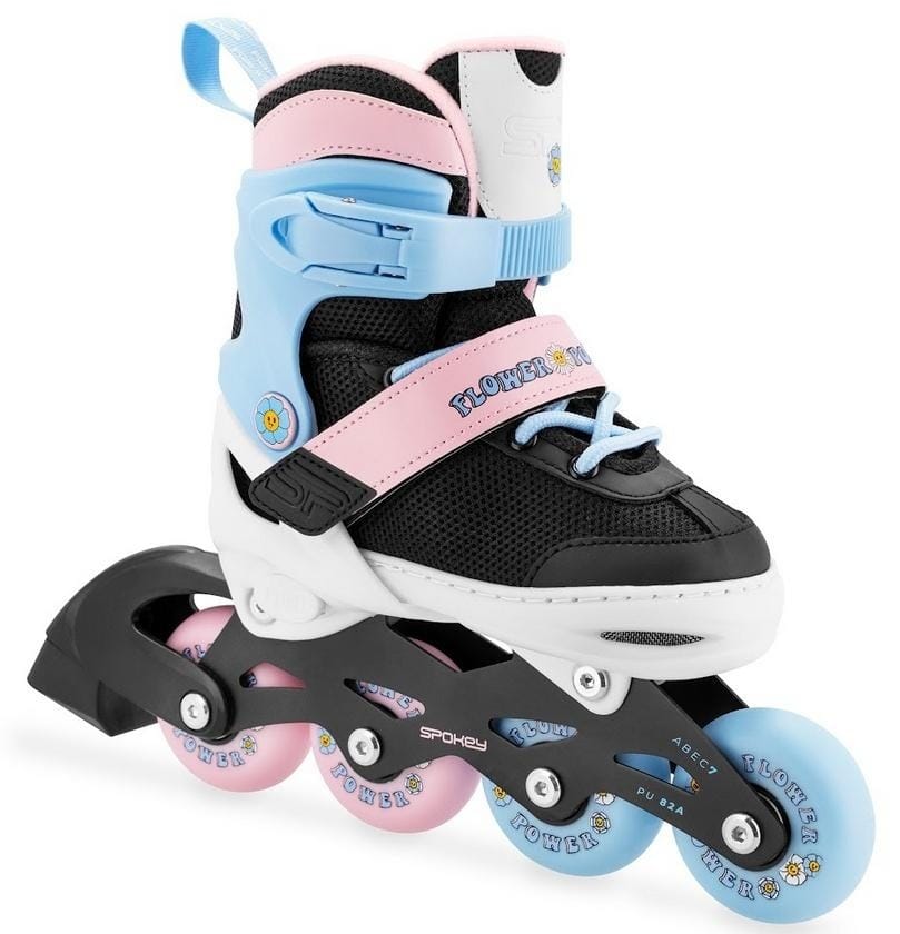Rolka regulowana dla dzieci wyposażona w aluminiową płozę, lekką a zarazem wytrzymałą, wysokiej klasy łożyska ABEC-7 Carbon i tylny hamulec. Zapięcie na klamrę dwusekcyjną, pasek z rzepem oraz sznurowanie gwarantują bezpieczeństwo w trakcie jazdy. Rolka wyróżnia się unikatowym, kolorowym designem i wyposażona jest w dwukolorowe kółka.
