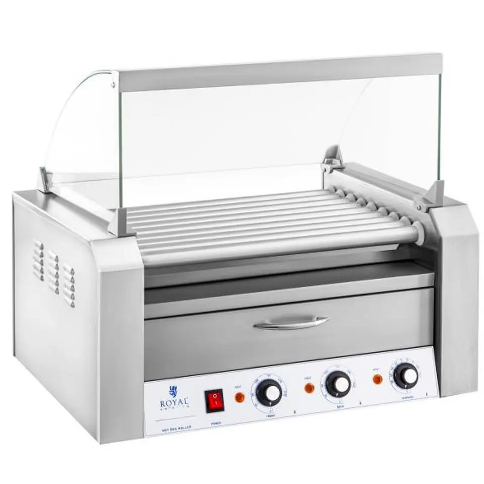 Nazwa producenta: RCHG-9WOGrill rolkowy Royal Catering to niezastąpione urządzenie w barach szybkiej obsługi, food truckach, sklepach spożywczych, punktach gastronomicznych na plenerowych imprezach, a także stacjach benzynowych. Model RCHG-9WO umożliwia równoczesne przyrządzenie 16 parówek, fankfurterek, kabanosów itp. Grill do hot dogów posiada 9 rolek ze stali nierdzewnej. Materiał ten zastosowano również do wykonania obudowy. Dzięki niemu sprzęt charakteryzuje się neutralnością dla zdrowia, solidnością oraz łatwym utrzymaniem w czystości. Ochronę przed czynnikami zewnętrznymi (np. zabrudzeniami, wiatrem) zapewnia osłona ze szkła hartowanego. Taca zatrzymuje tłuszcz i okruchy. Zakres temperatury wynosi od 0 do 250deg;C. Za sprawą jej podwójnej kontroli użytkownik może różnie podgrzewać wędlinę z przodu opiekacza i z tyłu. Moc maszyny to 2600 W. Dodatkowe udogodnienie stanowi szuflada do podgrzewania pieczywa (maks. temp. 110deg;C).Cechy: