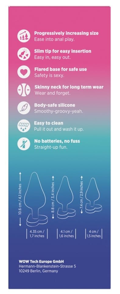 - Zestaw zawiera trzy akcesoria w rożnych rozmiarach (mały, średni, duży), pozwalające na stopniowe dopasowanie do indywidualnych potrzeb.