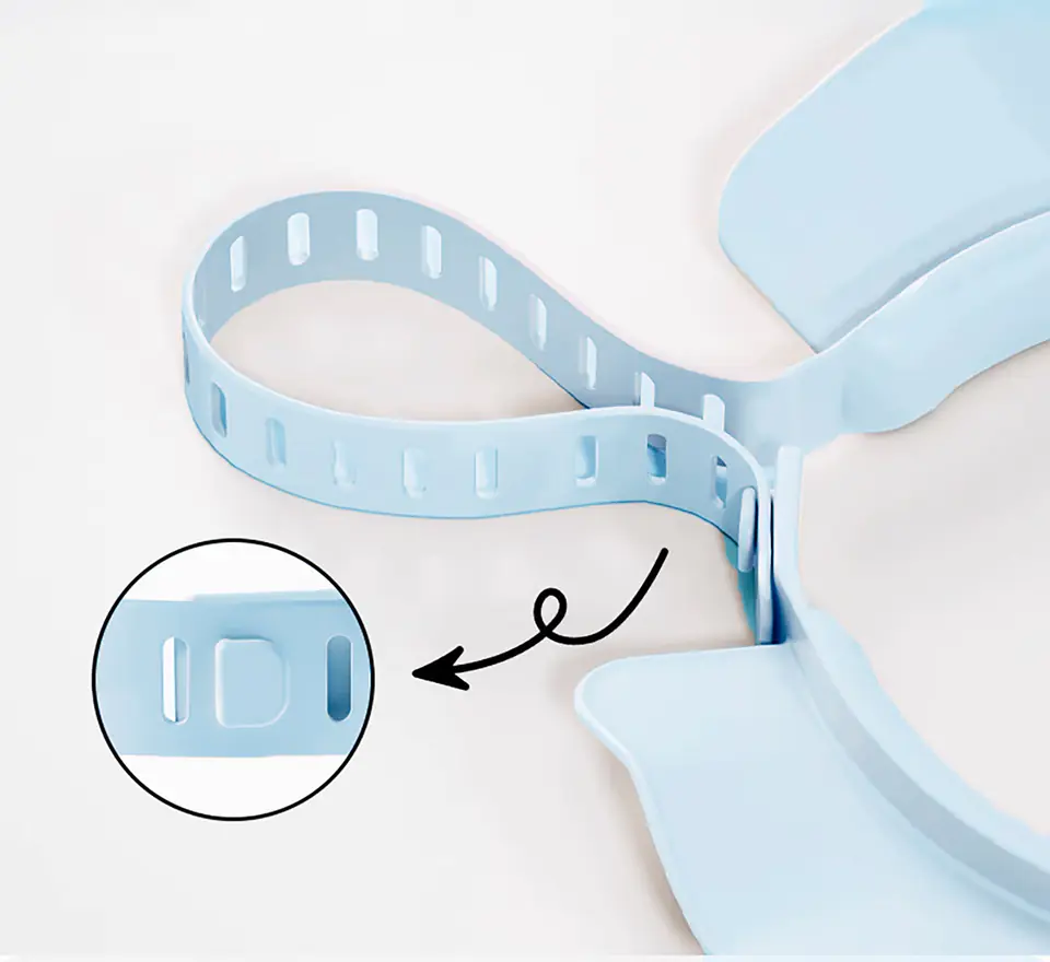 Dzięki specjalnie zaprojektowanej opatnetowanej konstrukcji, połączeniu dwóch materiałów ( sztywny daszek oraz miekki silikon ) rondo zabezpieczy oczy, uszy i twarz Twojej pociechy przed dopływem wody i szamponu. Delikatne, niebieskie wykończenie dodaje uroku i elegancji naszemu produktowi.