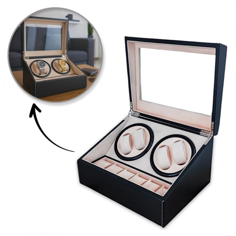 Elegancki Rotomat na 4 zegarki mechaniczne z automatycznym naciągiem Wystarczy uruchomić rotator aby obracał zegarek.Cykl obrotów to 2 minuty w jedną stronę, pauza - 6 minut, a następnie 2 minuty w drugą stronę, pauza - 6 minut.Cykle te będą się powtarzać aż do wyłączenia rotomatu.Dodatkowo posiada 6 slotów z poduszeczkami na zegarki Cechy produktu:- eleganckie wykończenie ekoskóra- wbudowany, niemal bezgłośny silnik elektryczny- wnętrze wyścielone miękką ekoskórą- szybka prezentująca zegarki- Zasilacz w zestawie Wymiary:Szerokość - 31 cmGłębokość - 23,8 cmWysokość - 12,5 - 18 cm Wymiary opakowania:36 cm x 29 cm x 24 cm Waga: 2,56kg netto / 3,1kg brutto
