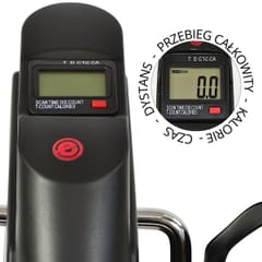 Wbudowany licznik prezentuje pięć parametrów: czas, dystans, liczbę obrotów, całkowity przebieg oraz spalone kalorie. Ułatwia to monitorowanie postępów i motywuje do systematycznego ruchu.