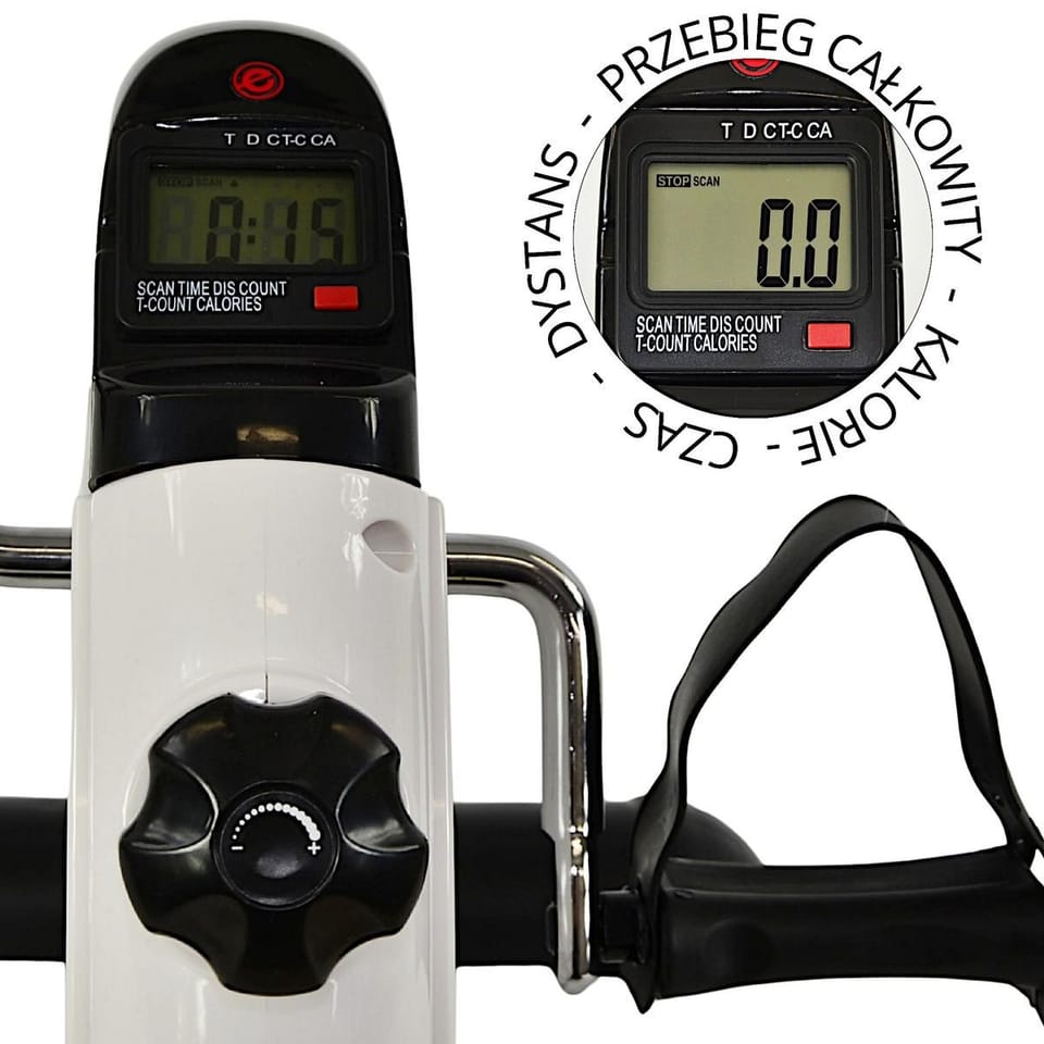 Wbudowany licznik prezentuje pięć parametrów: czas, dystans, liczbę obrotów, całkowity przebieg oraz spalone kalorie. Ułatwia to monitorowanie postępów i motywuje do systematycznego ruchu.