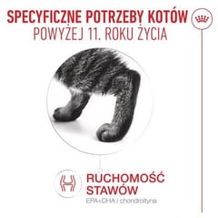 Karma ROYAL CANIN AGEING 11+ dostępna jest zarówno w postaci suchej, jak i mokrej, w różnych wariantach: kawałki w sosie, kawałki w galaretce oraz delikatny mus.Tekstura ułatwiająca jedzenieTekstura karmy ROYAL CANIN AGEING 11+ kawałki w sosie została opracowana i przetestowana przez koty starsze tak, aby ułatwić im jedzenie i sprawić, aby każdy posiłek był przyjemnością.Kompleks HealthyAge7Wyjątkowa receptura, zawierająca kompleks HealthyAge7, dostarcza precyzyjnie dobrane składniki pokarmowe, które pomagają wspierać 7 kluczowych obszarów związanych ze zdrowiem I witalnością kotów w wieku powyżej 11 latSKŁADmięso i produkty pochodzenia zwierzęcego (w tym hydrolizowana chrząstka (źródło chondroityny 0,002%)), zboża, roślinne ekstrakty białkowe, produkty pochodzenia roślinnego, oleje i tłuszcze, składniki mineralne, warzywa, drożdże, różne cukry.DODATKI (na 1 kg karmy)Dodatki odżywcze: Witamina D3: 310 IU, Witamina E: 105 mg, Witamina C: 85 mg, Tauryna: 1,1 g, Tryptofan: 1,4 g, Żelazo (3b103): 7 mg, Jod (3b202): 0,3 mg, Miedź (3b405, 3b406): 2 mg, Mangan (3b502, 3b503, 3b504): 2 mg, Cynk (3b603, 3b605, 3b606): 20 mg - Dodatki sensoryczne: Aromaty.SKŁADNIKI ANALITYCZNEBiałko: 9,6% - Włókno surowe: 0,5% - Zawartość tłuszczu: 4,0% - Popiół surowy: 1,4% - Wilgotność: 80,7% - Kwas linolowy: 1,2% - Fosfor: 0,15% - EPA+DHA: 0,12% - Beta-karoten: 3,4 mg/kg - Likopen: 1,5 mg/kg - Witamina A: 9600 IU/kg - Energia metaboliczna: 868 kcal/kg.